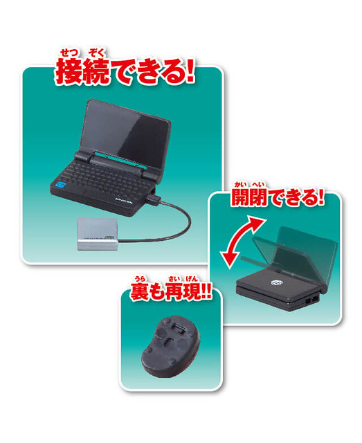 每一款的縮小版電腦商品,都做得維妙維肖,筆記型電腦可以開合,USB 裝置也可以真的接上電腦,滑鼠的底部也都刻意描繪製作出來,假如搭配一些人偶和其他的轉蛋產品,就可以打造出一個辦公的環境了。
