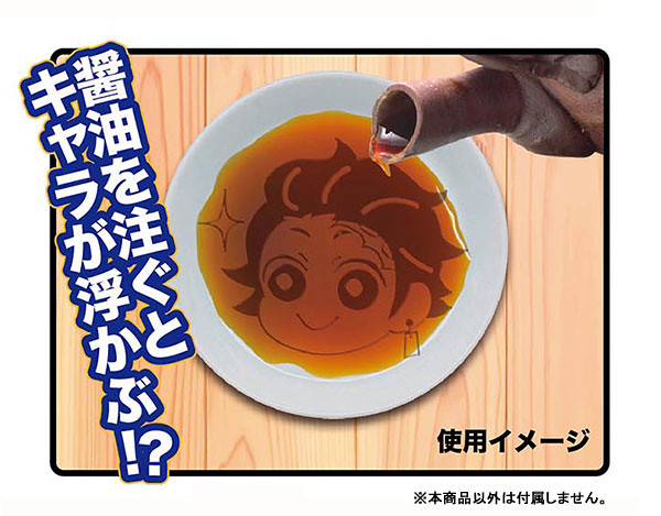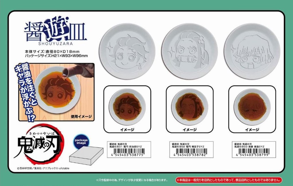 日本萬代 BANDAI玩具公司預計將推出週邊狂賣的超人氣動漫《鬼滅之刃》醬料小碟(鬼滅の刃 醤遊皿),以大熱門角色竈門炭治郎、竈門禰豆子、我妻善逸為造型,設計三款倒入醬油後就可以清楚看見圖樣的醬料碟,預計將於2020年03月發售。