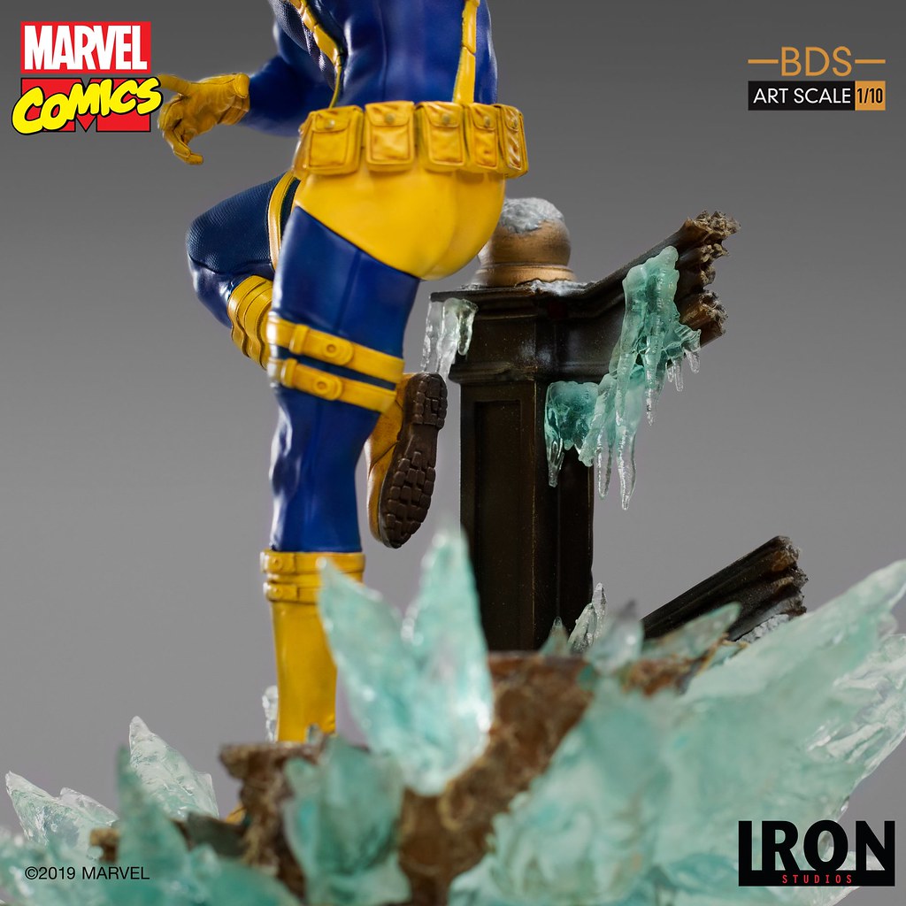 「BDS 獨眼龍」高約 21.5 公分,以極具躍動感的造型再現獨眼龍準備發射強力雷射的戰鬥姿態,由美漫大師 Jim Lee 設計、90 年代的藍黃配色 X戰警隊服超級帥氣,緊身衣底下結實的肌肉形狀也逼真地形塑,但抬起雙手的動作越看越覺得有種戰隊的趣味感,如果有附上雷射特效件可以搭配本作就更完美啦~!地台是以毀壞的 X學院為題製作,佈滿地板、扶手的冰柱特效也擁有出色的造型表現。