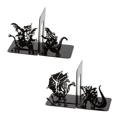 「哥吉拉 剪影造型書擋」使用鐵、EVA材質製作,用雷射切割出精緻又簡約的線條,具有質感又有份量,在辦公室、書房使用都很適合。由一左一右的書擋組成,兩款分別為「哥吉拉v.s戴斯特洛伊亞」 (ゴジラ VS デストロイア)與「哥吉拉v.s王者基多拉」(ゴジラ VS キングギドラ)的設計,將怪獸們交戰的熱血場面以剪影再現,在書桌上重現血脈噴張的《哥吉拉》世界觀!