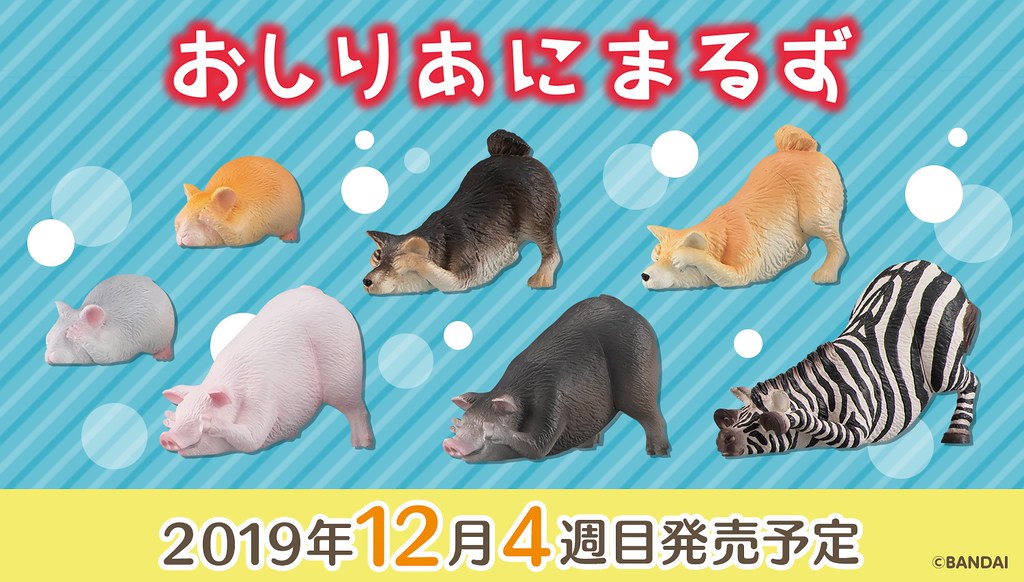 知名日本萬代玩具公司(株式会社バンダイ)旗下暢銷熱賣的轉蛋事業部 GASHAPON 將推出以掩著頭、把屁股翹得高高化身為鴕鳥般逃避的「翹屁屁動物」(暫譯,おしりあにまるず)轉蛋,一共推出七款,一轉售價為日幣 300元,預計將於 2019年 12月第四週發售!