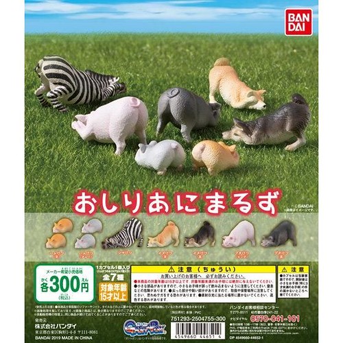小動物露出圓滾滾又毛絨絨屁股、毫無防備的萌樣讓很多人都無法抵擋,像是柴犬、柯基和小倉鼠的屁股,甚至推出許多屁股獨立週邊商品與攝影作品集等。這次也將動物屁屁轉蛋化,推出翹屁屁動物轉蛋,分別為:茶色倉鼠屁屁(ハムけつ 茶)、灰色倉鼠屁屁(ハムけつ グレー)、斑馬屁屁(シマけつ)、茶色狗屁屁(イヌけつ 茶)、黑狗屁屁(イヌけつ 黒)與粉紅豬屁屁(ブタけつ ピンク)和黑豬屁屁(ブタけつ 黒)七種款式,不只露出屁屁,看起來內心有許多OS的抱頭模樣,相信經過玩具人的巧思一定可以擺出許多有趣的場景!