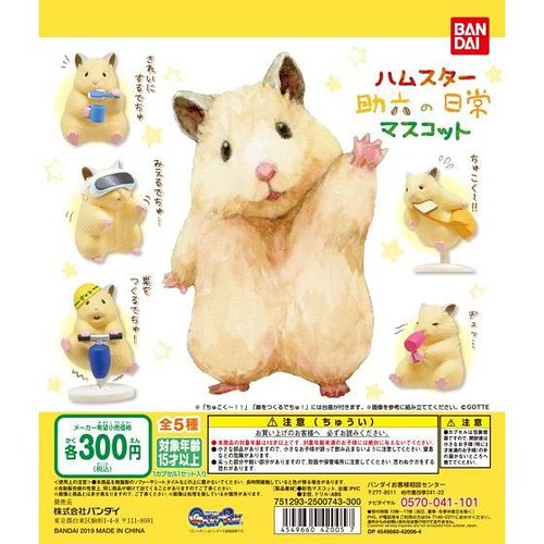 日本萬代公司轉蛋事業部 GASHAPON 將日本插畫家 Gotte 筆下的軟萌倉鼠轉蛋化推出!《倉鼠助六的單身日記》倉鼠助六 轉蛋(ハムスター助六 ハムスター助六の日常マスコット),以在推特和 Instagram爆紅的倉鼠助六插畫為主題,將五款人氣插圖實體化,一轉售價300日元,於 2019年 12月第二週發售!