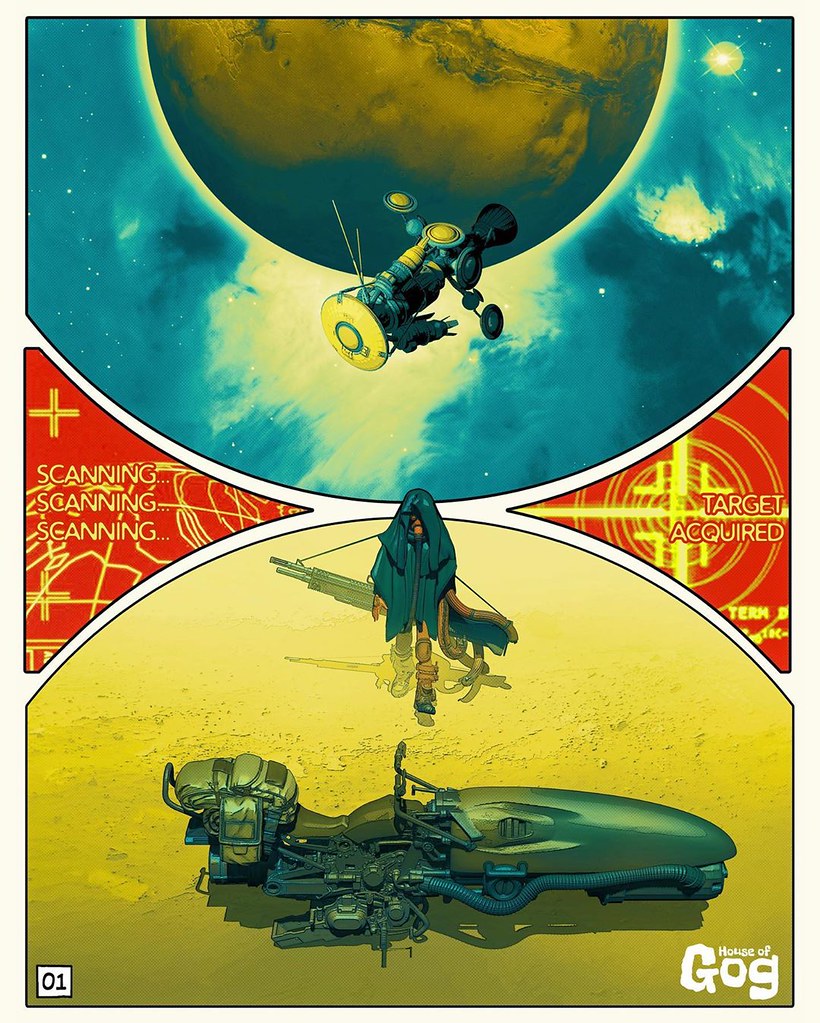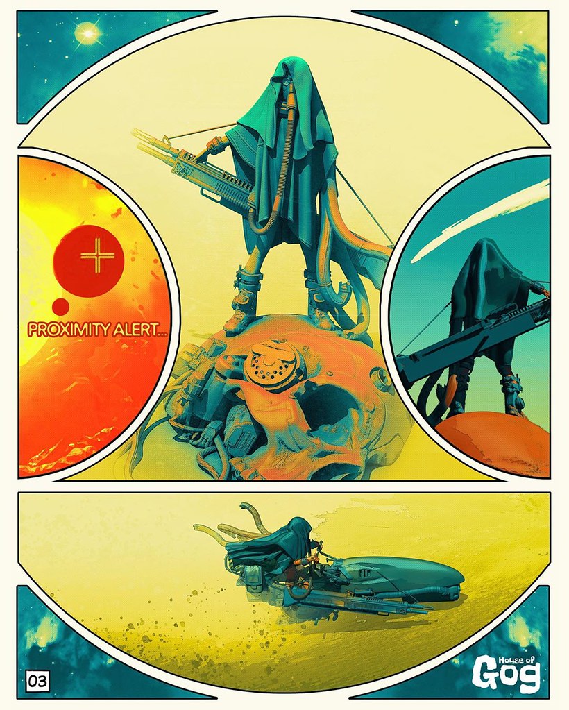 Pascal Blanché 畫作的色調運用大膽、獨特,同時有著迷人的科幻元素與未來感,本次的巨人獵手 Jaak,她的起源、背景故事就如同外表一般,覆蓋上一層神秘的面紗,沒人知道確切的資訊,但星系間的每個角落都傳說著 Jaak 神話般的豐功偉業,可以單手解決宇宙間最恐怖的惡棍、殺死島上最大的生物......;而現在,有流言傳聞她漫遊到了滿是死亡的荒涼世界 Derelict Planet,尋找最珍貴的獵物。