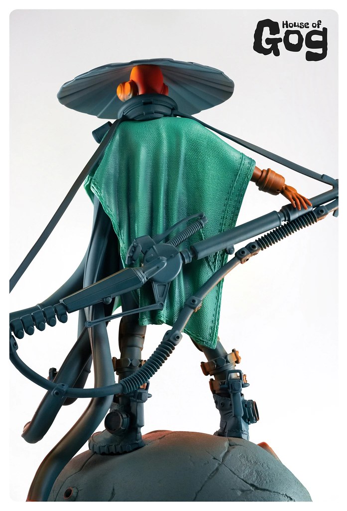 本作高約 40.6 公分,採用高質感的 Polystone Resin 製作,Jaak 披著綠松石綠披風,不只面罩連結著管線裝置,右臂部分粗大的管狀構造也呈現出宛如活物般的狀態,加上身後那把巨大步槍,整體散發出詭異但極具魄力的視覺效果,配件部分包含戴著斗笠的頭雕、尺寸驚人的長矛可以替換,地台則是根據超稀有獵物「Vermilion」機械感十足的頭顱打造,而且還附上兩個台座能展示不用的配件,作品各處的漸層色彩十分精美,造型設定也相當迷人~商品本體還有 Pascal Blanché 的親筆簽名,並附上複製畫作、收藏卡、證書。