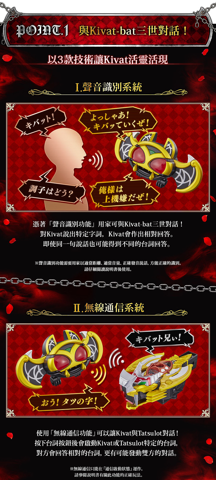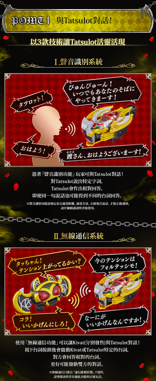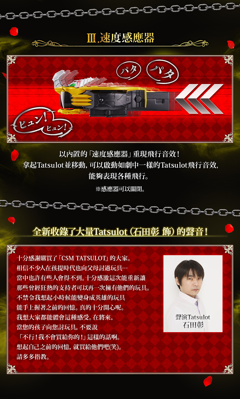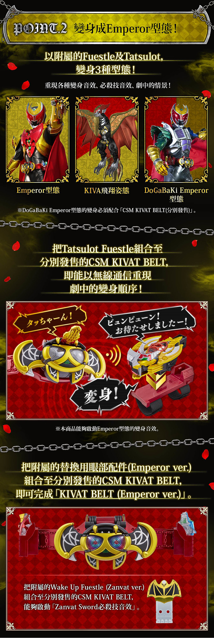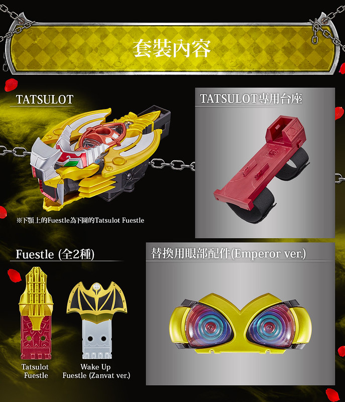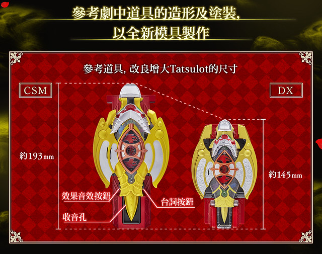 強化裝備「CSM Tatsulot」則依據 DX 版造型增大改良,內容包含 Tatsulot 本體、專用台座、KIVAT BAT 三世魔皇型態用眼部、2 種 Fuestle。邀請到聲優石田彰先生為商品重新錄製大量語音,「聲音辨識系統」、「無線通信系統」、「速度感應器」三項機能基本與 KIVAT BAT 三世相同,除了能播出魔皇型態的各種音效外,也能與另售的「CSM KIVAT 變身腰帶」連動,透過無線通信系統再現劇中的變身順序!