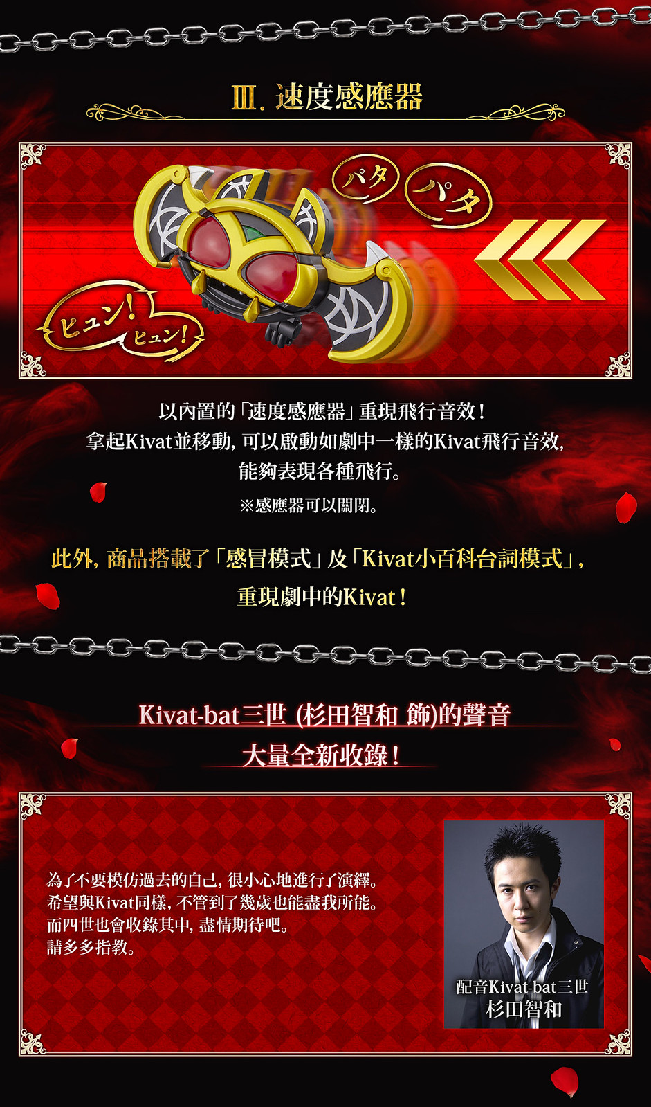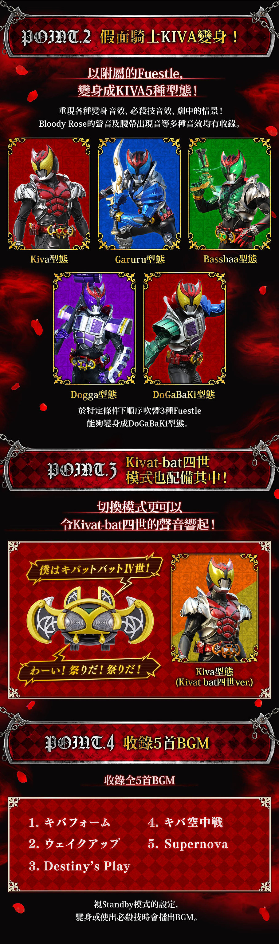 讓 KIVAT BAT 三世咬入 6 種 Fuestle 後便能播出各個形態的變身、必殺技...等音效,更有「感冒模式」、「小百科模式」、「KIVAT BAT 四世模式」可再現劇中台詞,以及 5 首變身或使用必殺技時播出的 BGM!