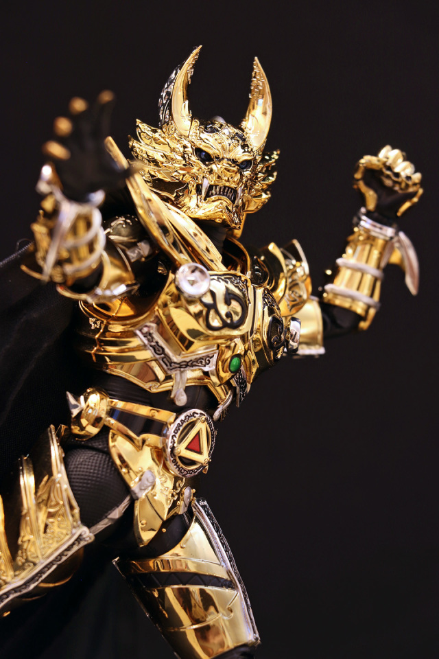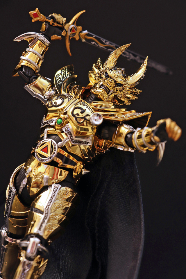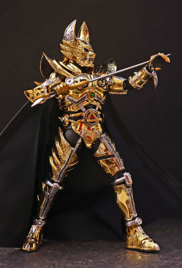 主體全高約 168 mm。真骨雕的外型還原了皮套的外觀,包括了頭大身細......!雖然線條及著色較複雜,但 QC 還可以,我那只上臂有部分脫色,但比起之前推出過的所有 SHF 牙狼無論輪廓或造型上都有不少進步!那不同層次的金色塗裝和精緻的刻紋我真的是愛死了!