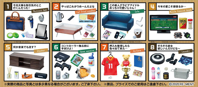 以日本為例,在東京或是大阪等大城市,有許許多多的人,多半為了工作等目的,都過著一個人生活的日子。這款由 RE-MENT 所推出的盒玩,特別以男性的單身居住者的角度,將其所生活的環境之可能出現的元素,以盒玩之縮小模型的方式呈現出來,包括各種傢俱、日用品、家電、玩具、甚至是健身用品、衣物、以及雜誌等等,全都一覽無遺,並且還以各種副標主題呈現,共有 8 種款式如下: