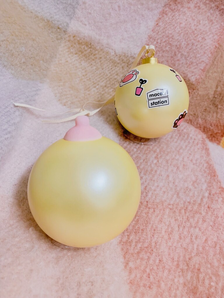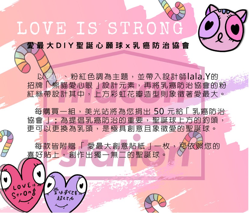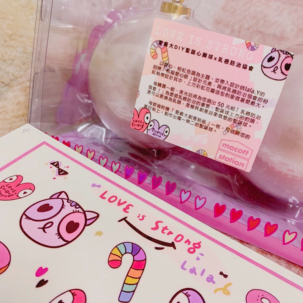 每款聖誕球都會附上一個 18 禁的小盒子,裡面附有乳頭兩顆、底座、緞帶,讓大家把聖誕球改造象徵愛的乳房,呼籲大家重視乳癌防治的重要!兩款也都會附上專屬水貼及貼紙,做出獨一無二的造型~聖誕球禮盒將於 12 月 21 日於台中草悟道限定發售(數量有限售完為止)。