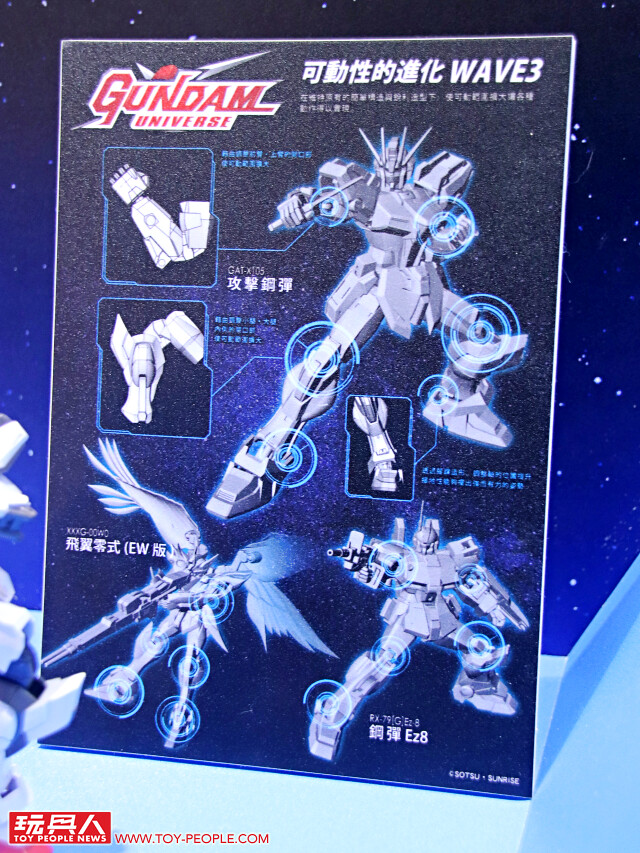 接著是「GUNDAM UNIVERSE」系列的機體展示,其中收錄攻擊鋼彈、飛翼零式(EW版)、鋼彈Ez8 的第三波也曝光啦!而且還有可動再進化的解說立牌,堆坑力道再升級!