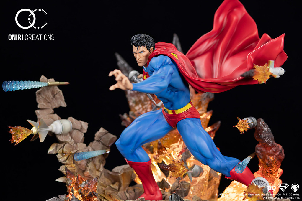 而超人本體之外,敵人那猛烈的砲火則完完全全變成襯托他有多麼強大的裝飾品,速度再快的飛彈,在超人眼裡都跟靜止不動沒什麼兩樣,本作以透明樹脂(Clear Resin)製作飛彈的軌跡,高明地捕捉了充滿視覺張力的一瞬間!佈滿裂痕的岩石、飛彈撞到岩石所產生的爆炸特效都十分逼真,地台還有三處搭載了 LED 發光功能,點亮之後更具臨場感,超人手裡還有一枚被捏爛的飛彈,實在太兇啦!