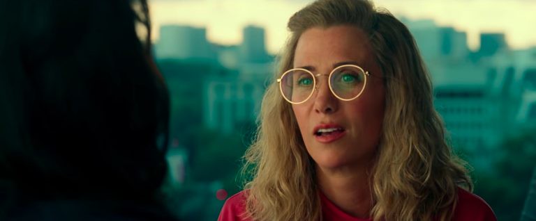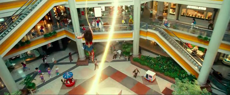 80~90年代,成功商人最具代表性的事業,就是經營大賣場。 這樣的元素在許多重現該時期的電影、影集中都能看到,近期最具代表性的就是《怪奇物語》第三季的『星城』。 而這一幕神力女超人在大賣場對抗恐怖份子,除了帶出時代背景的象徵地標之外,也是致敬「DC重生」時期的神力女超人起源故事。