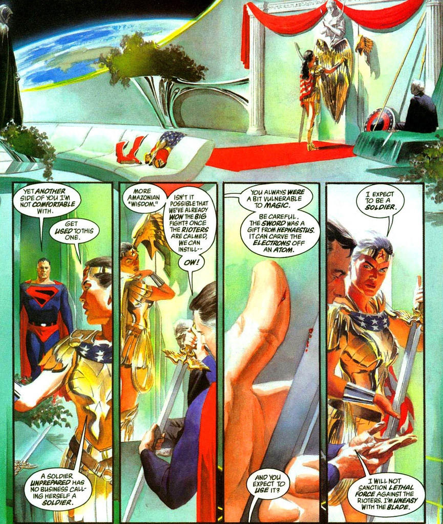 神力女超人本身就具備了相當強大的神力,也因此金鷹裝甲是為了因應相當危急的狀況;這套裝甲首度出現,就是運用在大危機之中。