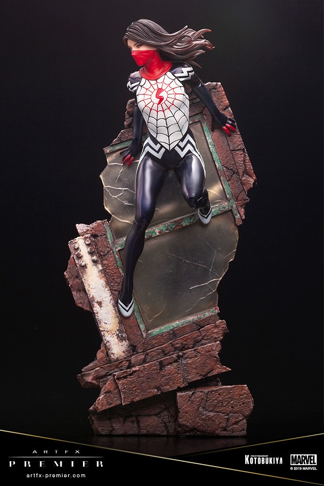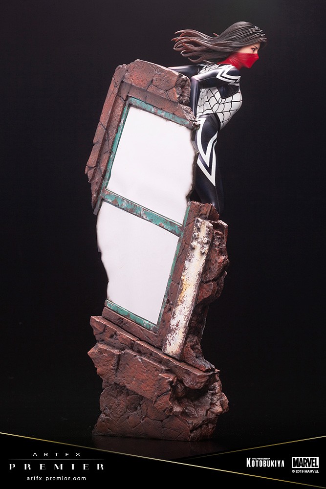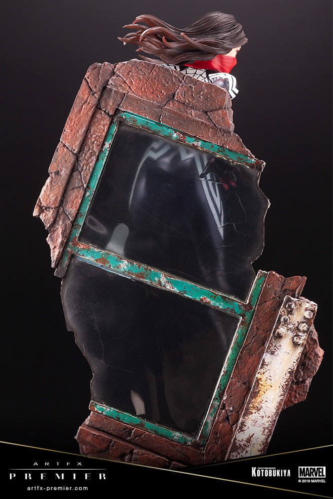 「ARTFX PREMIER 蛛絲」高約 26 公分,以蛛絲吸附在殘破建築物上的姿態設計,雖然鼻子以下都被紅色領巾覆蓋住,但絲毫不減她的魅力,露出的雙眼透出銳利、堅毅的神采,眉毛更施以細膩造型,膚質、飄動的長髮也十分出色,特色的蜘蛛緊身衣刻畫出精美的網格紋路與漸層色,地台同樣藏有豐富細節,碎裂的玻璃、斑駁鏽蝕的建材皆相當逼真!不得不說壽屋搶在蜘蛛人、蜘蛛關之前推出蛛絲著實令人驚喜。