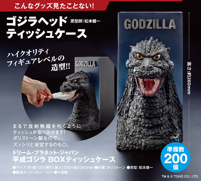 「平成哥吉拉 立體頭像衛生紙盒」採用 POLYSTONE 材質製作,全高約 26 公分,由怪獸原型師鮫順(松本健一)擔任哥吉拉原型製作,可將整包衛生紙放入後方盒中,然像吐出熱線一般從哥吉拉口中抽出衛生紙!