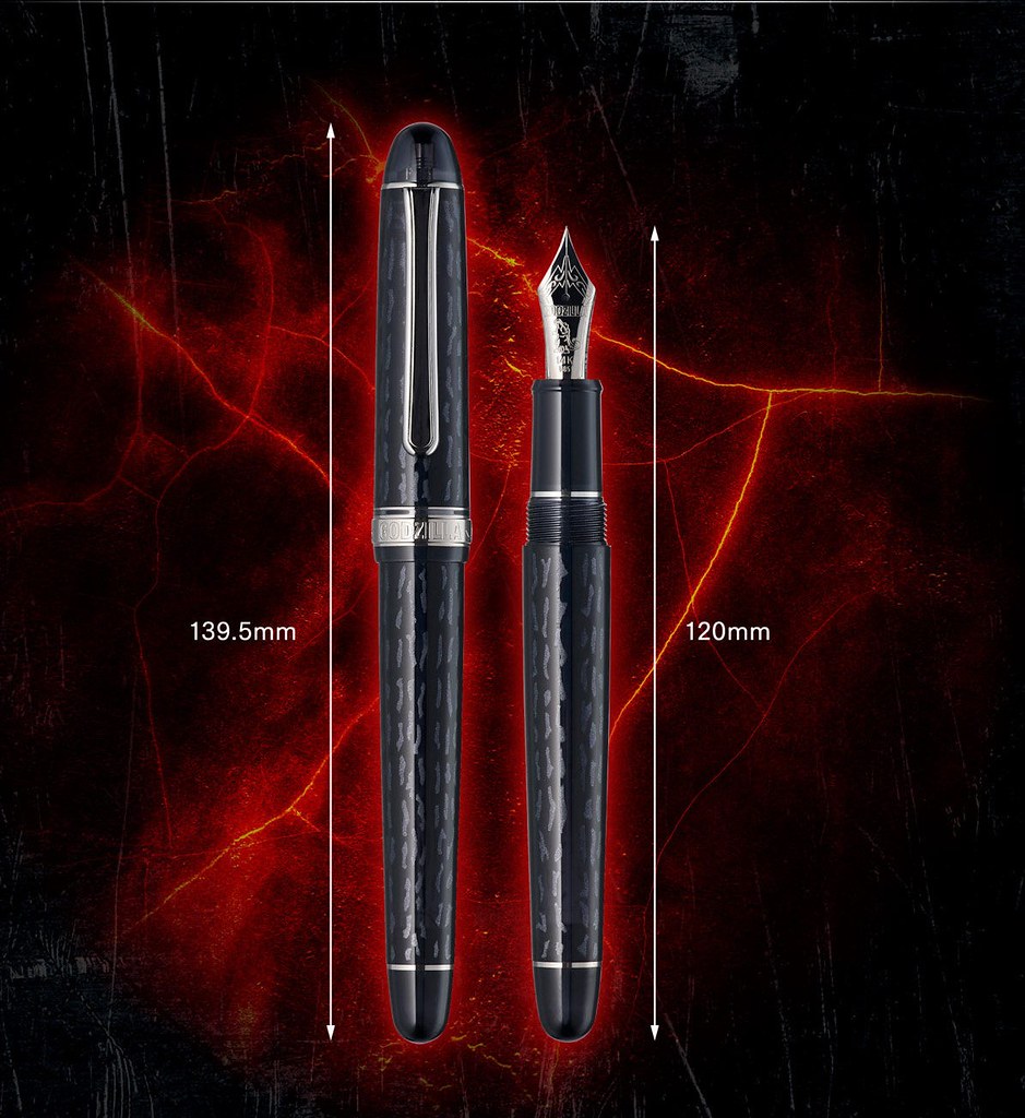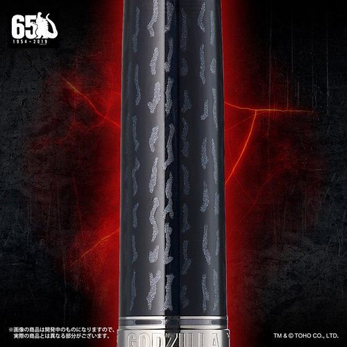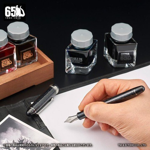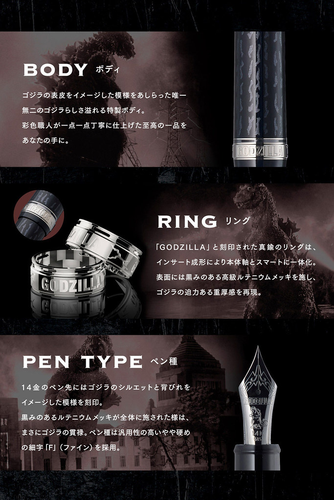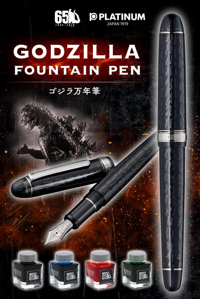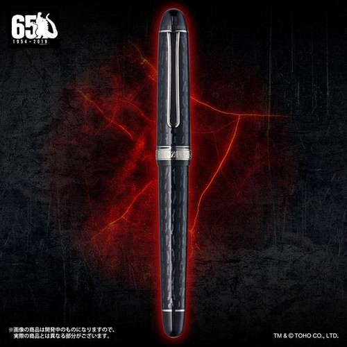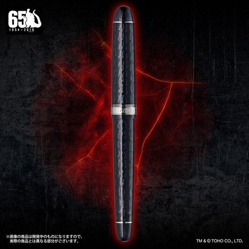 與日本老牌 白金牌PLATINUM(プラチナ万年筆株式会社)合作的「哥吉拉鋼筆」,筆身以怪獸王者哥吉拉為造型,設計靈感來自哥吉拉的膚色及特殊紋路,使用以樹脂與玻璃顏料混合的材質,在光線照射下會反射淡淡的亮光。筆套上的銀環刻有「GODZILLA」的字樣。使用14K筆尖,筆尖上刻著哥吉拉的圖樣,並使用黑色鍍層。