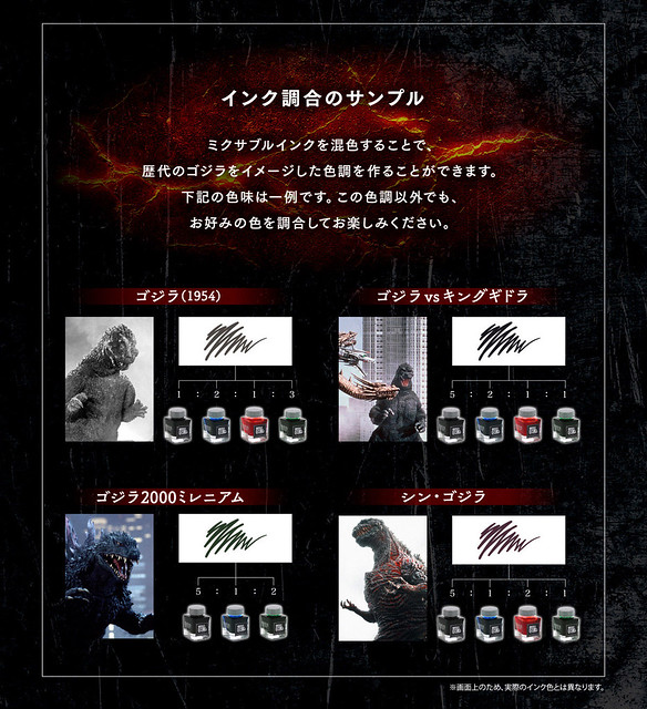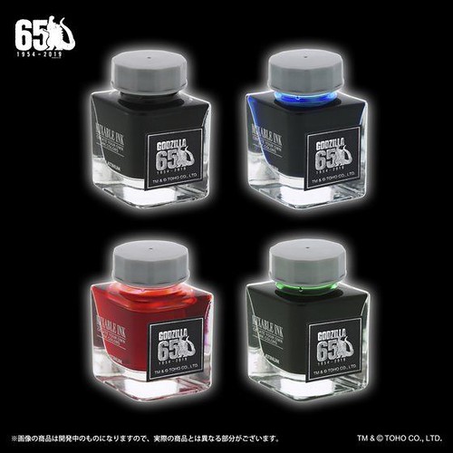 套組含有四瓶特製墨水,可以混合和調配出哥吉拉的顏色,並且可以透過組合墨水顏色來享受各種色調,也可以原色(黑、藍、紅、綠)使用。墨水瓶是限定款推出,瓶身有哥吉拉65週年紀念的標誌。值得喜歡哥吉拉的玩具人收藏一組!