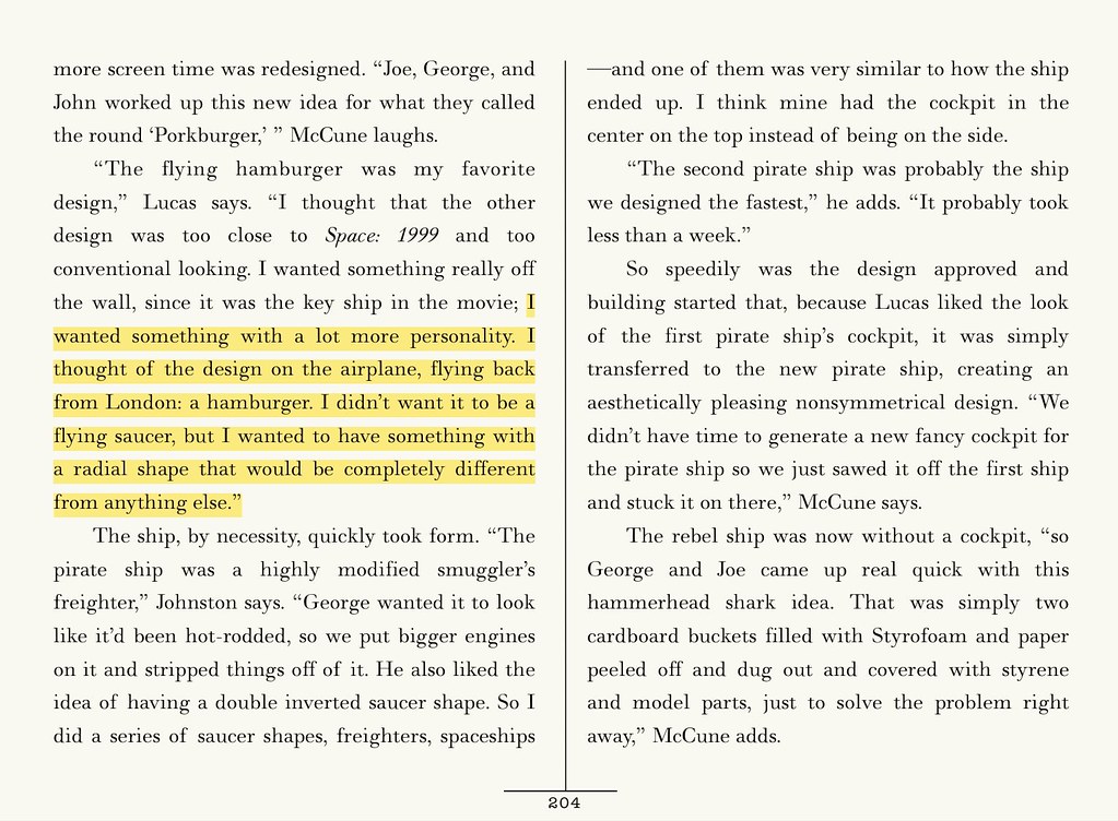 而且更糟的在後頭,千年鷹號又回到了原點。麥奎里與強斯頓必須再次設計全新的船艦外型,他們得畫出具有韓索羅風格的飛船外型──這是太空電影,角色們在戰場上不能搖下車窗露出俊帥的表情,他們的飛船便成了他們的化身,必須看起來夠像他們,又要讓觀眾在一片混亂的畫面裡,馬上識別出他們的英雄。喔喔,等等,我忘了提一件事,麥奎里與強斯頓必須在一個禮拜之內,就完成新版的海盜船設計。