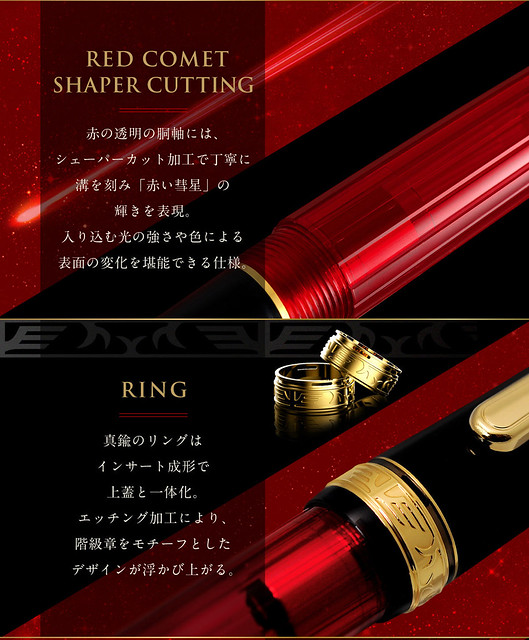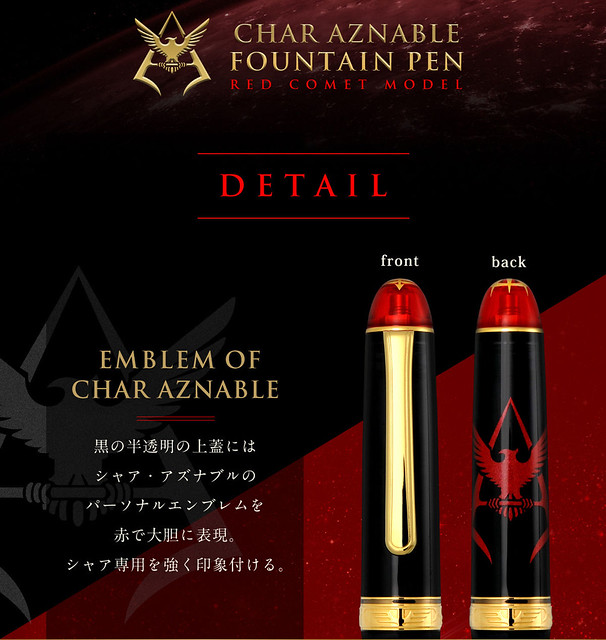 筆身由深紅色透明材質製成,設計靈感來自夏亞的經典「紅色彗星」稱號,表達出紅色彗星的光澤,並能依照不同角度透光,展現出不同的表面變化,帶著華麗卻低調的高質感。筆身有夏亞的個人專屬標誌,頂蓋則是吉翁軍的標誌,皆以金色印刷,增強整體奢華感。一拿出來就能展現夏亞的氣勢不凡。