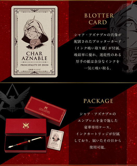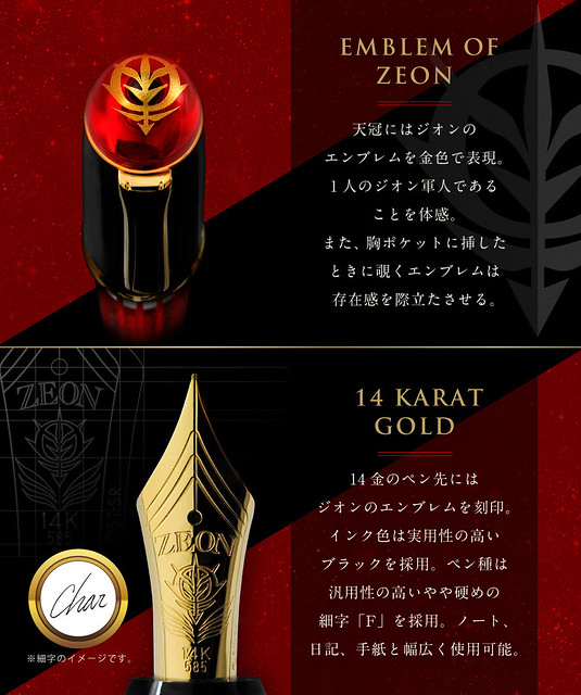 先前曾推出過以夏亞為設計的原子筆,這次質感再升級!與日本老牌 白金牌PLATINUM(プラチナ万年筆株式会社)合作,推出紅色彗星 夏亞鋼筆,筆尖採用14K金尖,上面刻有吉翁的字樣與標誌,並以F尖(0.25mm~0.34mm)的細字尺寸,可以廣泛使用於一般書寫和日常書信。