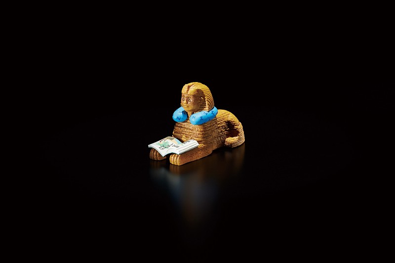至今仍充滿謎團的獅身人面斯芬克斯(Sphinx),在神話中為長著翅膀盯視沙漠的怪獸,這次卻成為套上頸枕、看雜誌看到喥估的趣味模樣。