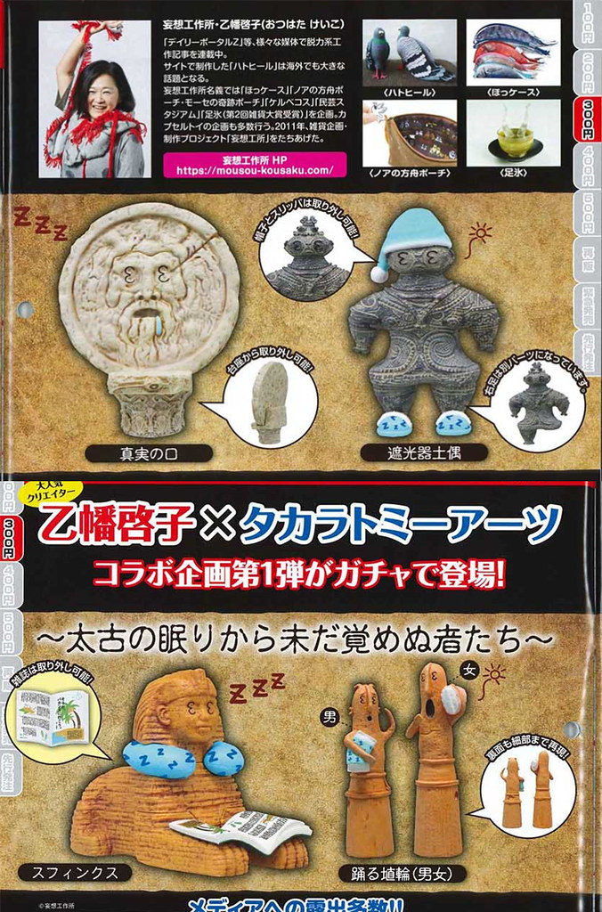 日本 TAKARA TOMY 公司旗下轉蛋玩具品牌 T-ARTS 與推出多款趣味設計的「妄想工作所」設計師 乙幡啓子合作,推出以世界古文明為設計的轉蛋商品「睡眠遺跡-那些還沒從古代睡眠中醒來的古文物」(暫譯,ネム遺跡-太古の眠りから未だ覚めぬ者たち),一共有四款,每款售價為一轉日幣 300元,預計將於 2020年 1月下旬發售。