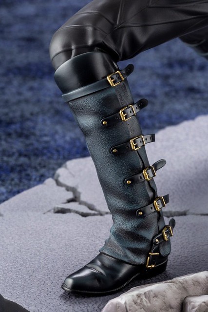 這款 ARTFX J 系列的維吉爾立體人形,以 1/8 的比例製作,採用的造型是來自於《惡魔獵人5》的新造型,這一代的維吉爾與但丁彼此之間的相像程度又更加差異化許多(在3代的時候還有點像),維吉爾的外型看起來比但丁乾淨俐落許多,同樣喜歡將頭髮豎起來,身上的衣著同樣以黑皮衣造型為主視覺,搭配與他相稱的藍色做為識別,在衣服上甚至是內裡,都有完整精細的花紋。手上準備拔刀一閃的閻魔刀(YAMATO)上細部也沒有遺漏,與之前推出的尼祿和但丁擺在一起的話,可說是完整地將惡魔獵人5的情景重現。