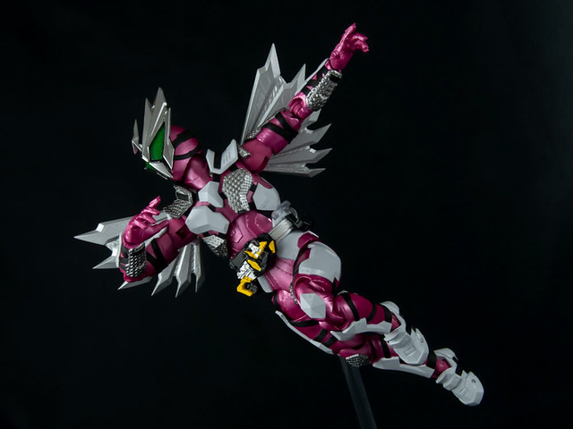 「假面騎士迅 飛翔獵鷹型態」再現了極具特色的非對稱頭部、複眼內的格紋細節、彷彿鋼板的全身鎧甲與腰帶細節,透過金屬色塗裝讓整體質感更為提昇。配件則包含了替換用造型手掌左右各4種、重現背部羽翼展開的翅膀零件,能夠配合本體高度可動再現各種戰鬥場面,以及帥氣的必殺技「Flying Utopia」!