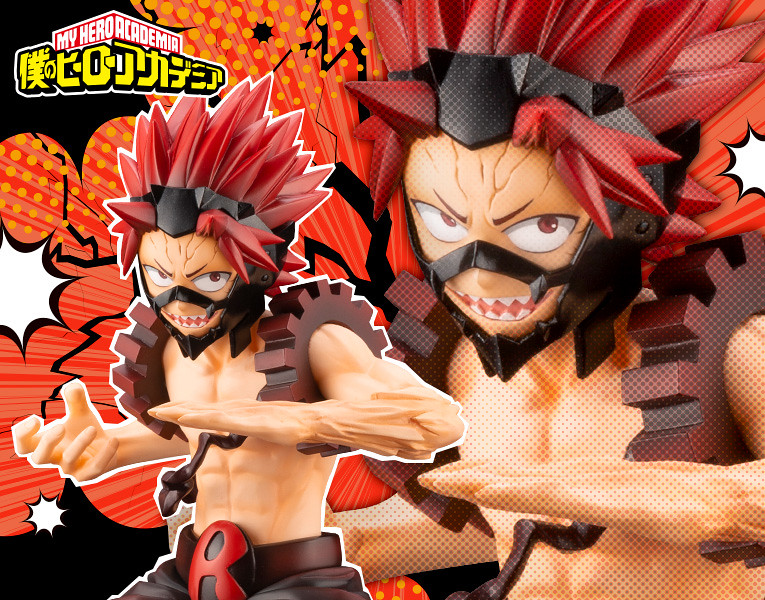 切島銳兒郎1/8 比例模型,以約 21.5 公分的尺寸呈現,露出招牌特色鯊魚牙的鬼氣微笑,精實的半身肌肉與臉部與手作出硬化的質感,充滿硬派的個人特色!在壽屋玩具公司線上商店訂購此作,多附有特典「無頭罩的頭雕」配件(マスク無し頭部パーツ)可以替換。喜歡我英系列的玩具人可以收藏~