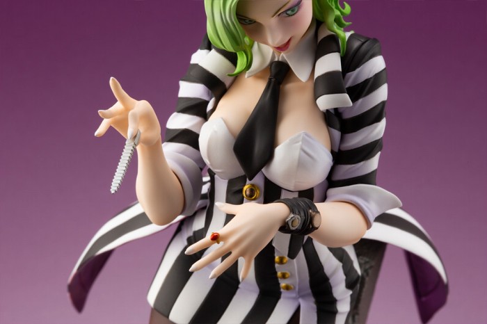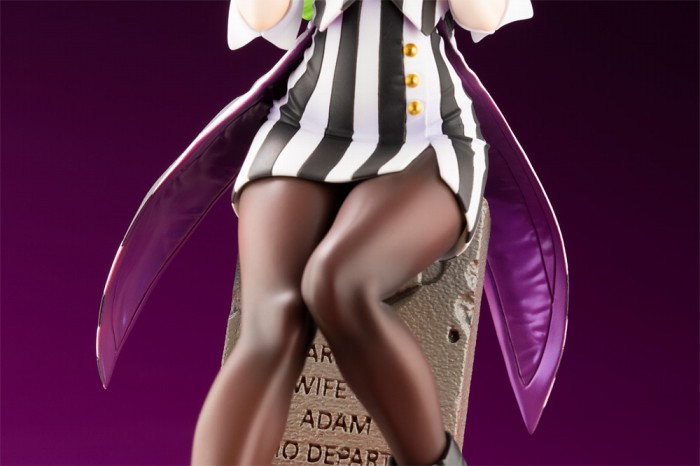 「HORROR美少女 陰間大法師」高約 21.5 公分,高度再現了山下俊也筆下性轉之後的美少女版本 Beetlejuice,保留了綠髮與黑白條紋的造型特徵,只不過把男性套裝改為貼身洋裝與長靴的火辣搭配,有著十足的肉感體態與迷人的漂亮臉蛋,綠髮施以細膩刻畫,紫色的眼妝使其更為豔麗,坐在 Barbara 的墓碑上、正要修手指甲的姿態有種荒誕的幽默感!如果有這種陰間大法師來家裡嚇人,小編才不走咧:D