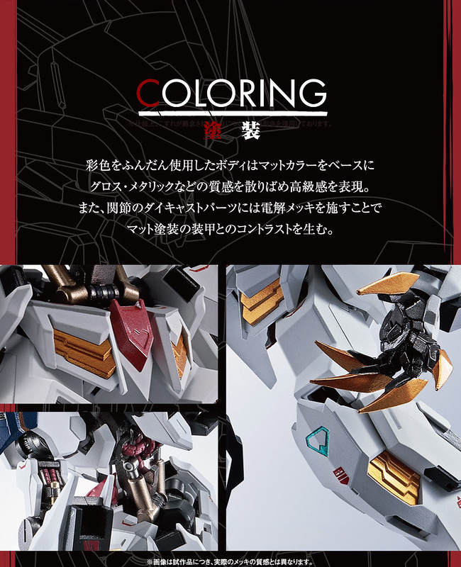 在塗裝部份,以消光白的裝甲色彩為基礎,在頭部天線、散熱口、手爪、尾鞭刀...等多處都使用大量金屬色塗裝,合金零件也經過電鍍處理,突顯《鐵血孤兒》特色的「鋼彈骨架」細節。全機也都有完整的鐵華團標誌、機身編號、警示標誌等貼紙,讓機體更具真實感。