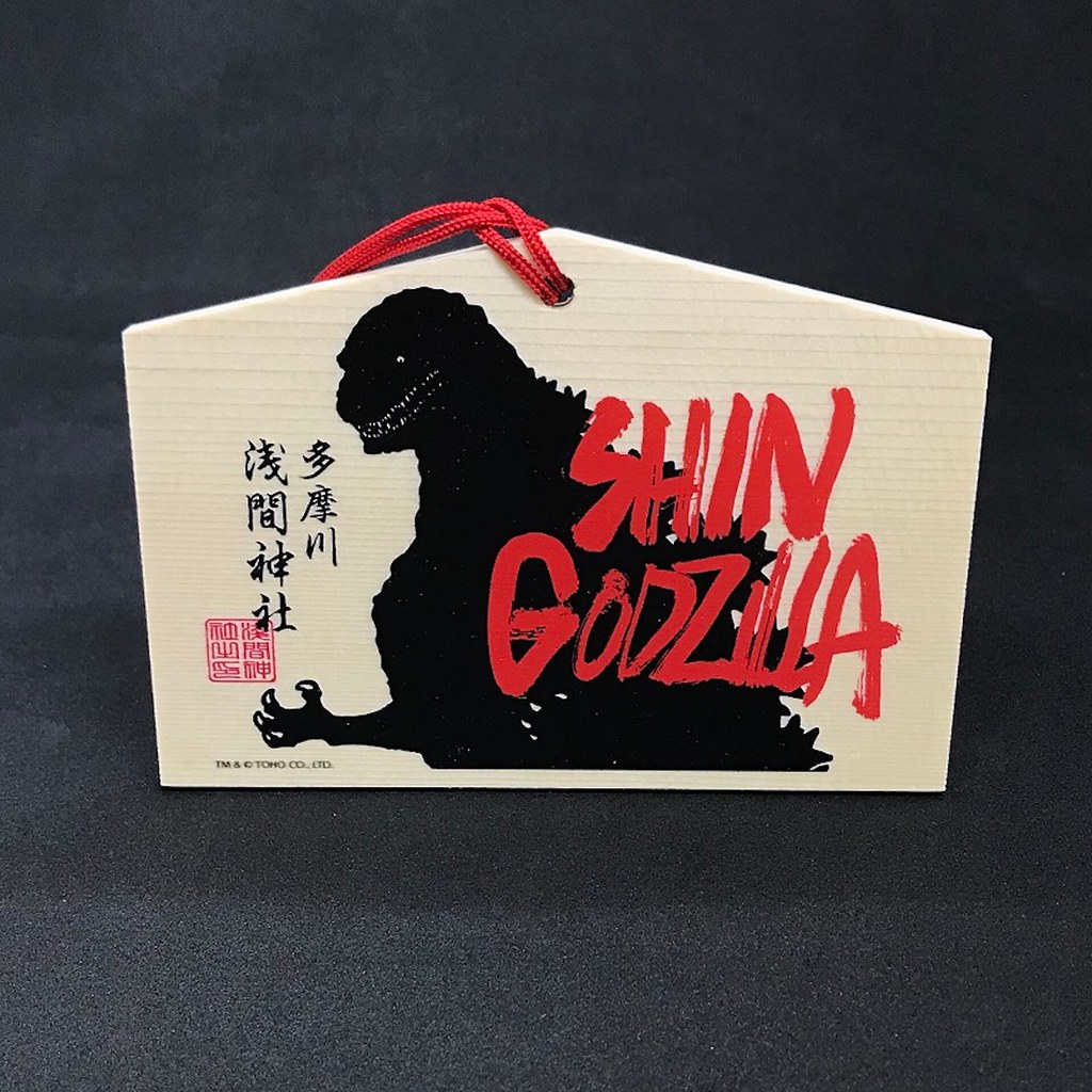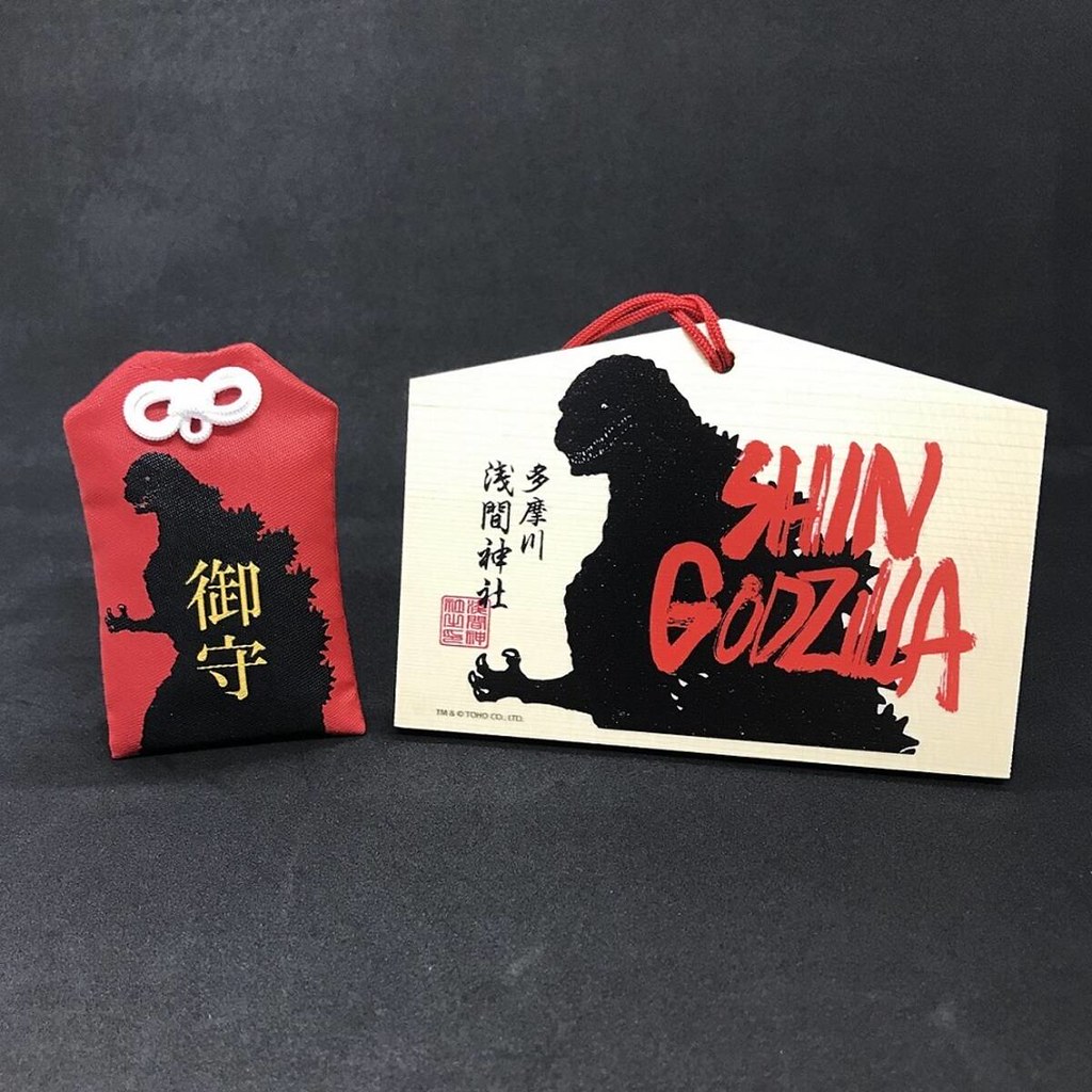 東京「多摩川淺間神社」,與電影《正宗哥吉拉》(シン・ゴジラ)合作推出了以《正宗哥吉拉》為設計的多摩川浅間神社御守和繪馬套裝,以及毛巾。於 2019 年 12 月 26 日起在多摩川淺間神社和東京哥吉拉專賣店限定販售。