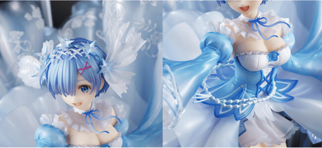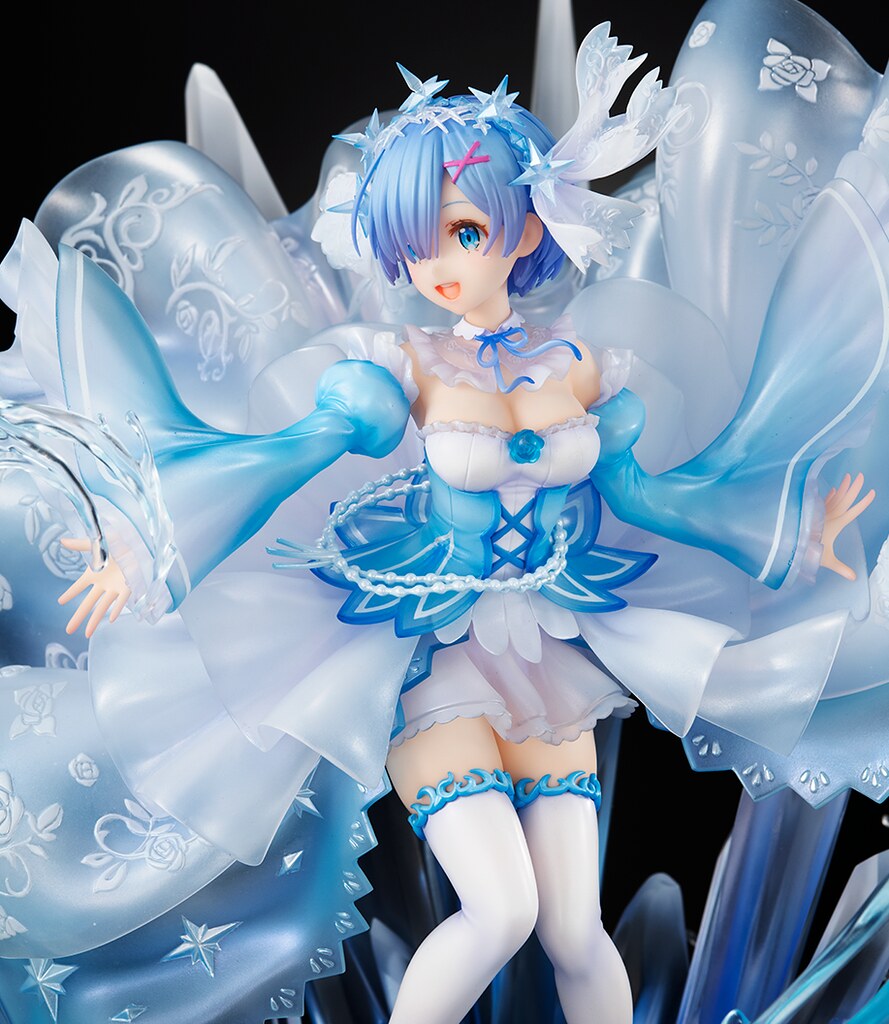 雷姆身穿的禮服相較之下較為可愛,但絲毫掩不住好身材。細節裝飾與禮服的造型都相當精緻,雷姆開朗的可愛笑容展現十足魅力。禮服裙襬充滿彷彿飛舞在空中的飄逸感,搭配四射的冰花,不論從哪個角度看都相當完美且充滿魅力!