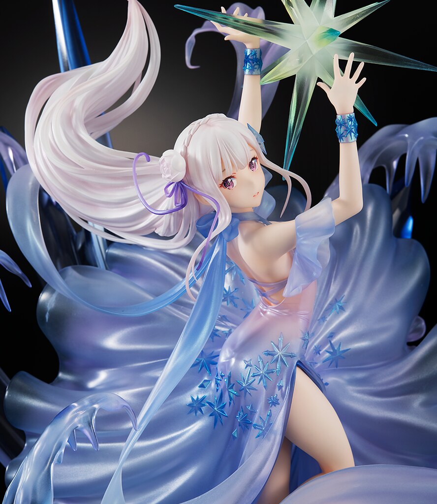整體為高347mm x 寬326mm 的尺寸,禮服大膽地露出愛蜜莉雅白皙的背部和大腿肌膚,側身回眸的姿勢配上飄舞的頭髮與裙襬以及環繞四周的冰花特效,讓整體充滿了華麗唯美的舞動感!
