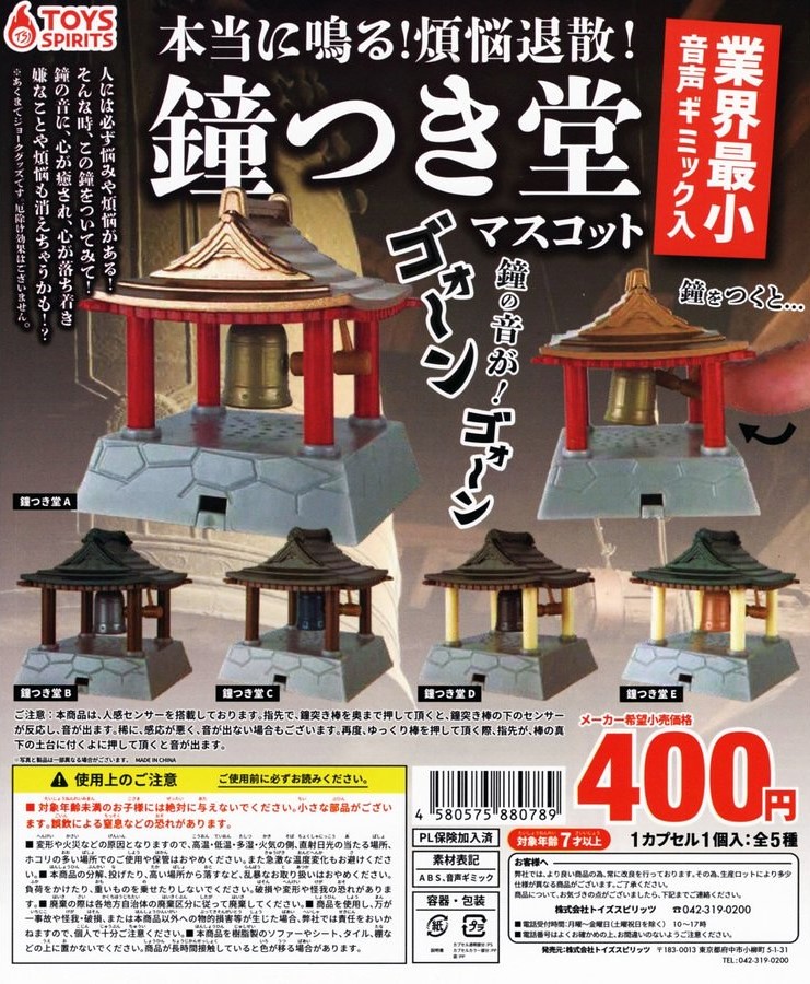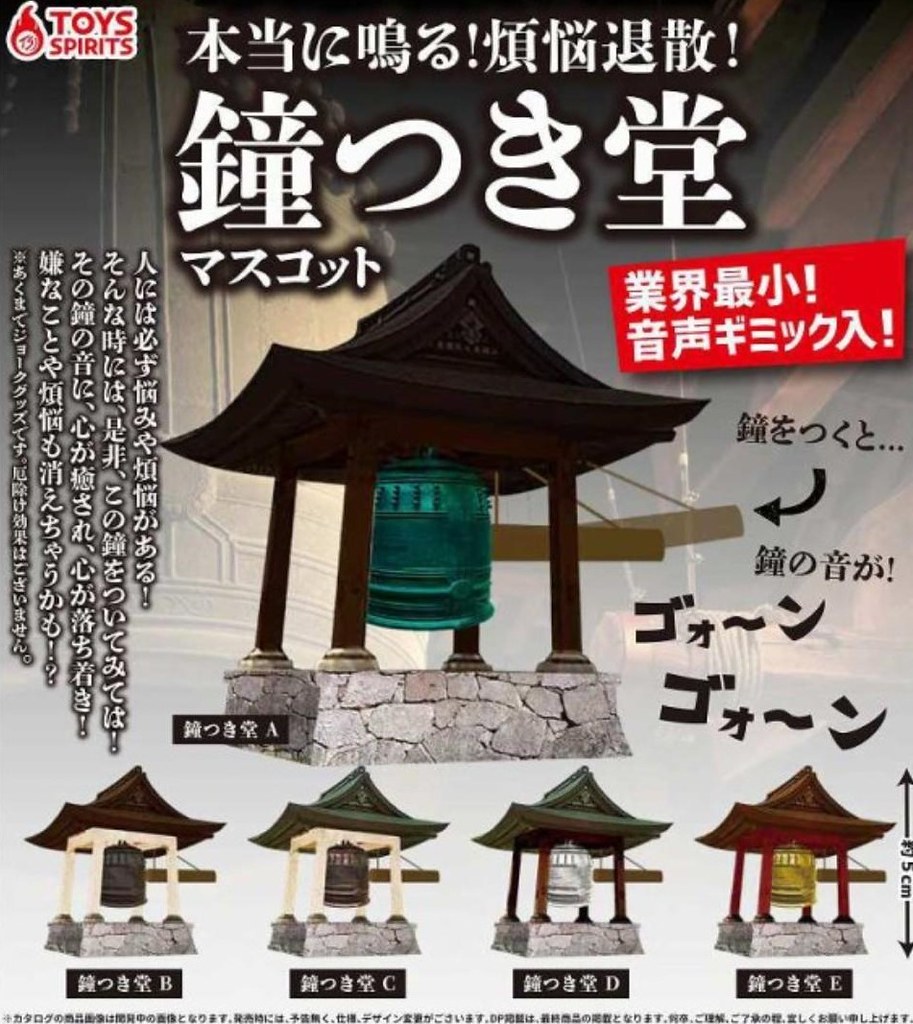 日本轉蛋公司 TOYS SPIRITS 推出一款以日本寺廟「梵鐘(ぼんしょう)」為主題的趣味轉蛋,內建音效裝置的「真的會響喔!煩惱退散!敲鐘堂」轉蛋(暫譯,本当に鳴る!!煩悩退散!鐘つき堂マスコット),共有五款,每轉售價400日幣,於2019年12月下旬發售。