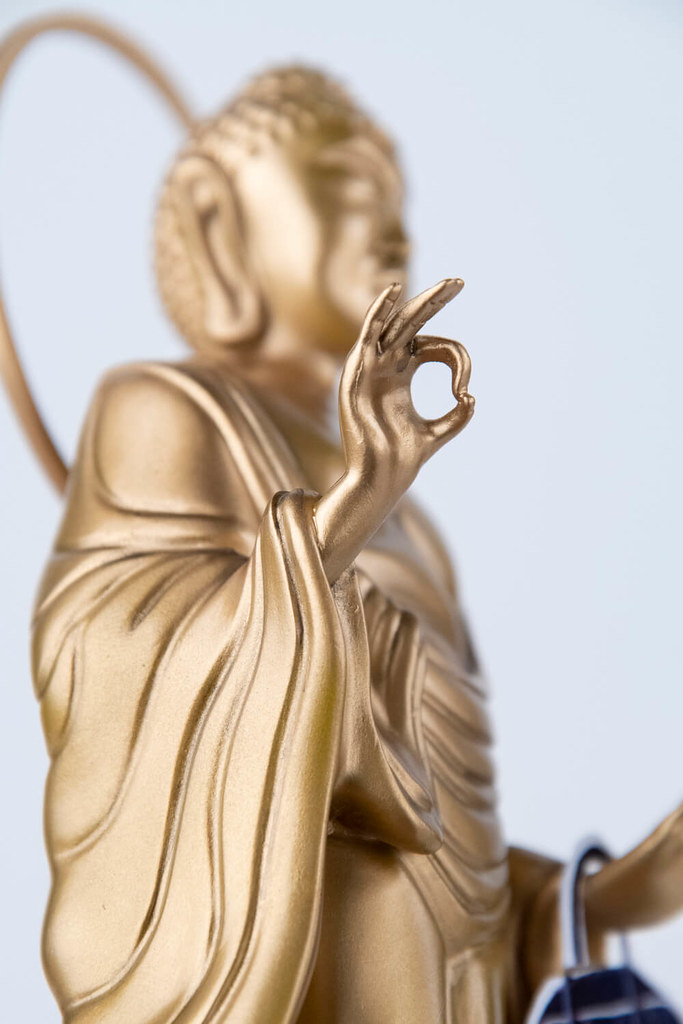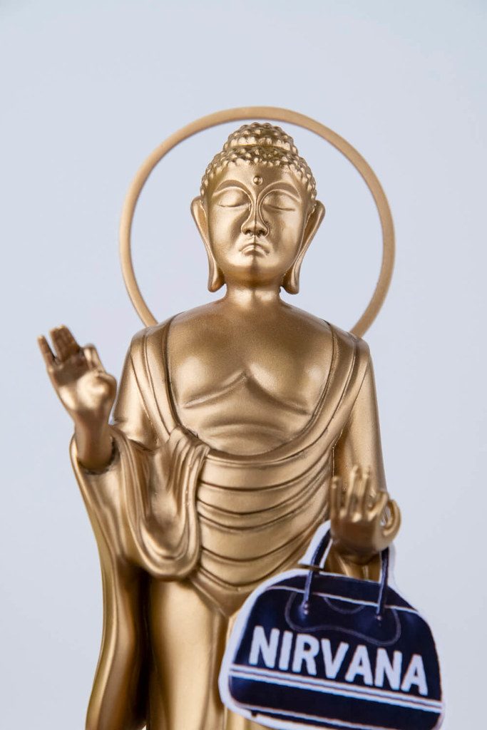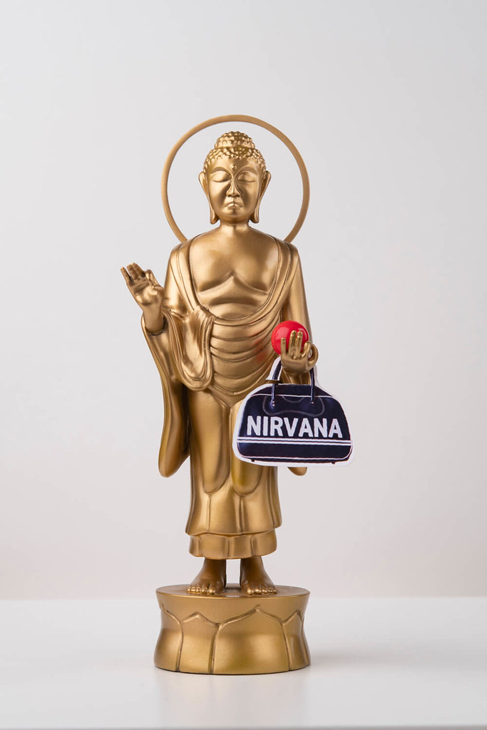 本次以劇中在超市抽獎抽中的金佛像為主題,透過17公分高的小尺寸,呈現在家中被拿來當擺飾玩物的金佛像-佛陀 Junior(佛陀Jr.),配件除了有一顆紅色抽獎彩球外,還附有佛陀最愛的「NIRVANA」超脫手提包,可以還原劇中被拿來當置物架的模樣!