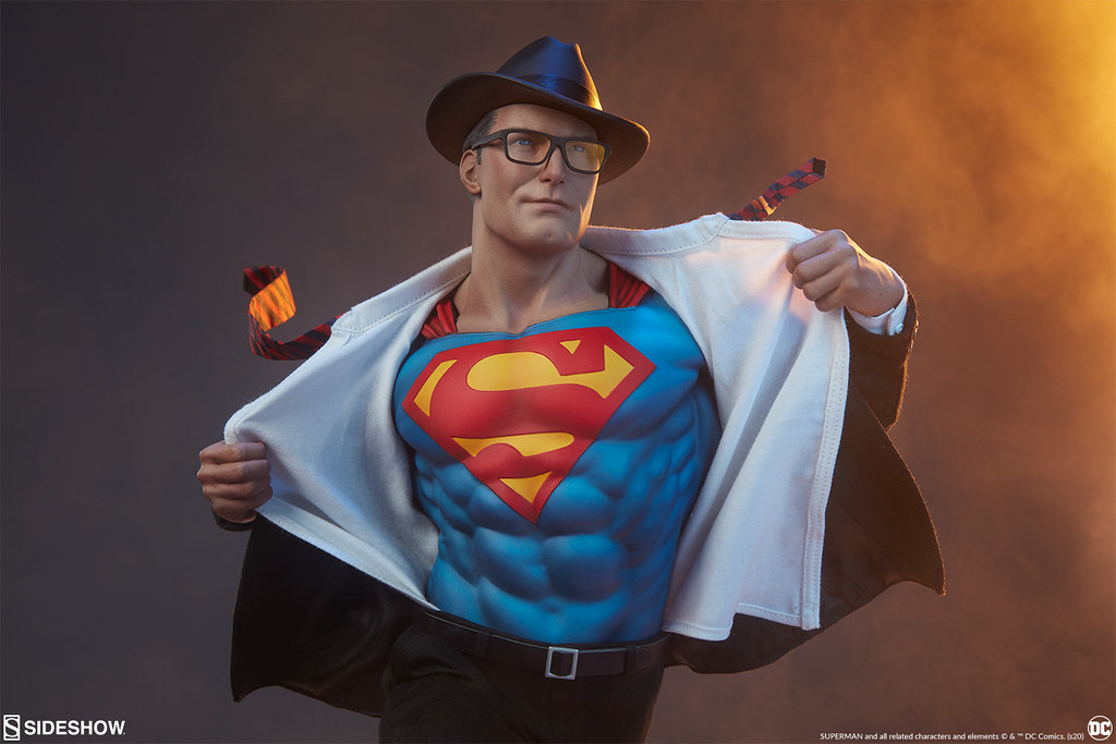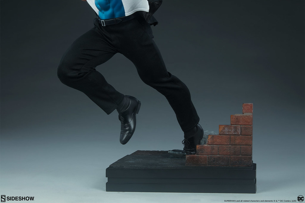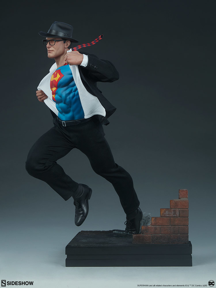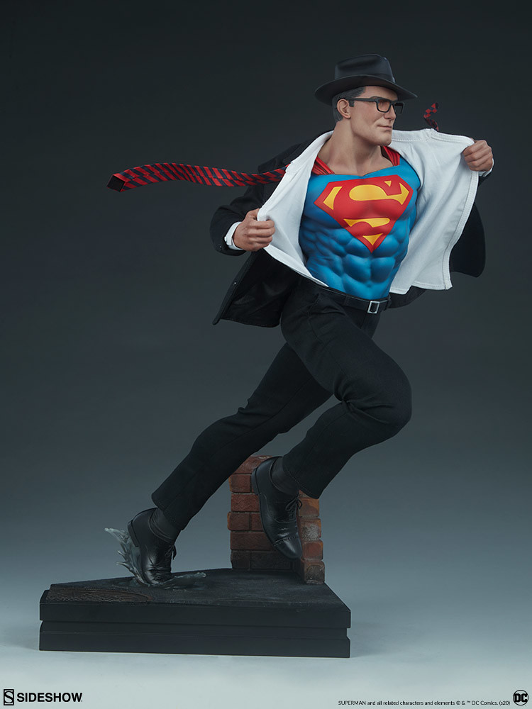 超人「凱·艾爾(Kal-El)」以「克拉克·肯特(Clark Kent)」的身份居住在大都會,並在《星球日報》當一名記者,平常西裝筆挺上班的克拉克,只要一聽到有人呼救就會跑道無人的巷子裡,褪去西裝外衣、迅速飛向天空!而從西裝裡出現的「S」標誌也是超人粉絲再熟悉不過的經典符號;本次的雕像作品就是以超人正解開西裝上衣、準備出動的造型設計。