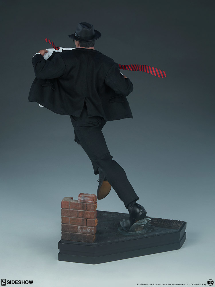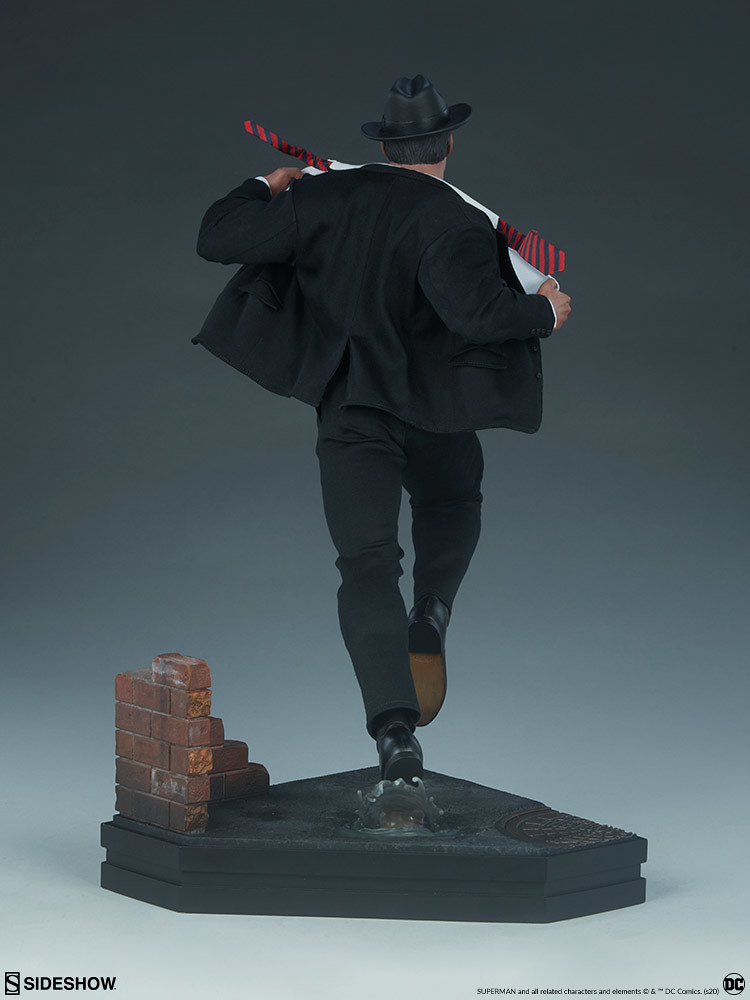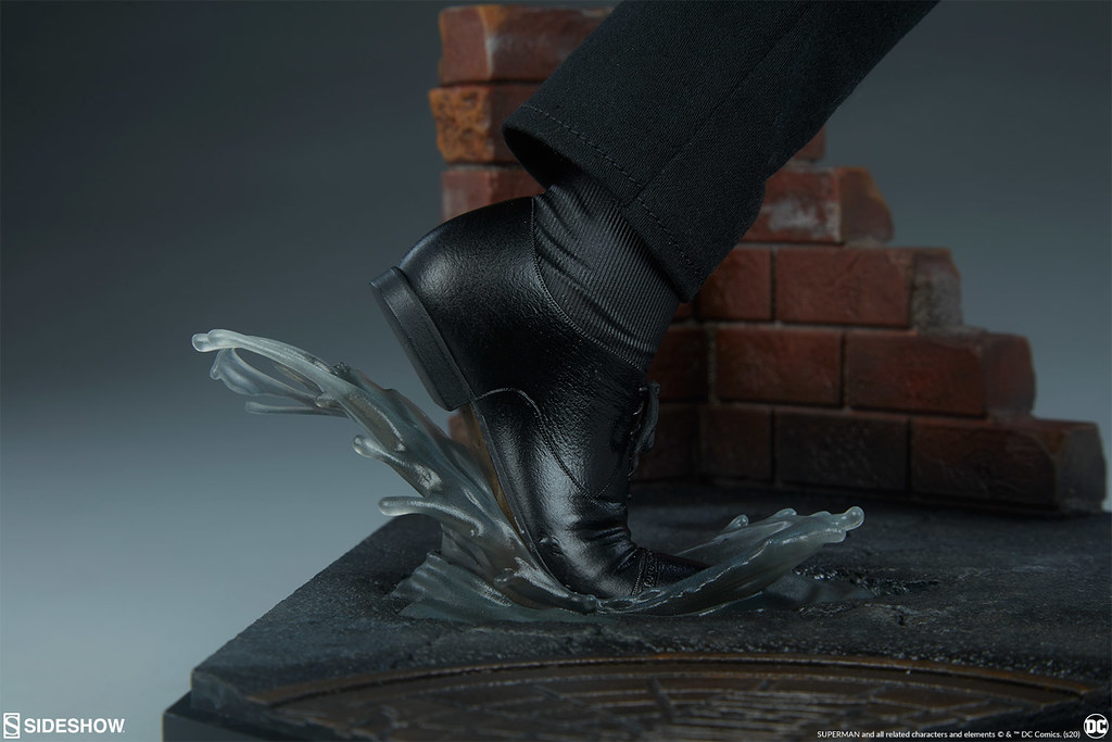 本作高約 49.5 公分,在造型呈現上極為精彩,奔跑的雙腿、飛舞的領帶與外套下擺、因為皮鞋踩踏而濺起的水花,動態感滿滿!胸腹的肌肉形狀更是張力十足,超人本體與藍色緊身衣是採用 Polyresin 打造,黑色西裝、白色襯衫則是採用真實布料材質製作,黑紅條紋領帶裡頭還有內置鐵絲喔~另外,除了戴著紳士帽、佩戴眼鏡的克拉克·肯特頭雕之外,還附屬了招牌油頭的超人頭雕。