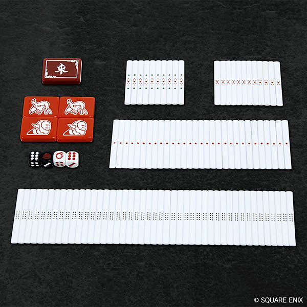 完整還原遊戲中的多瑪麻將造型,以寬20mm x高28mm x厚17mm的尺寸呈現,重現喚獸仙人掌、鯰魚等圖樣,外殼包裝也充滿了《FINAL FANTASY XIV》的可愛吉祥物~內容物除了麻將與點棒以外,還有「烤雞」指示牌。專用麻將桌布分開販售,參考售價為 7,480 日幣,想要拿來打台灣麻將的玩具人可以考慮單買麻將墊。