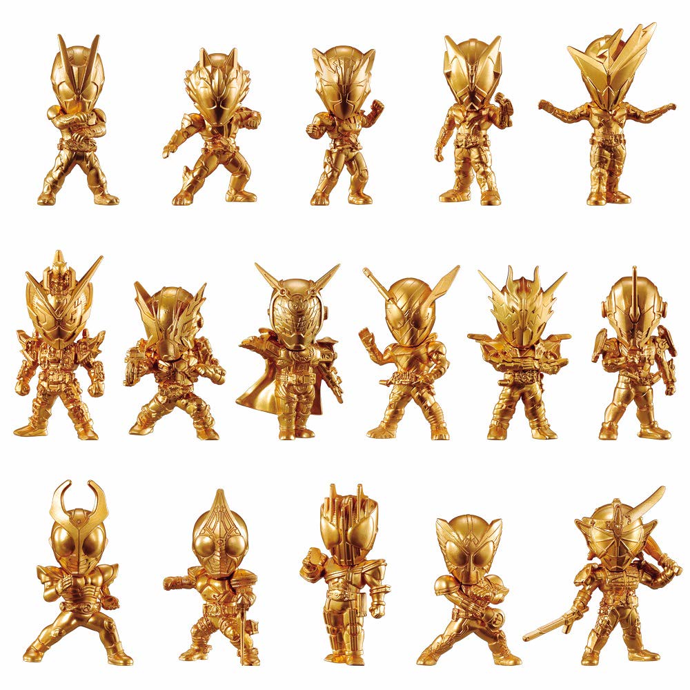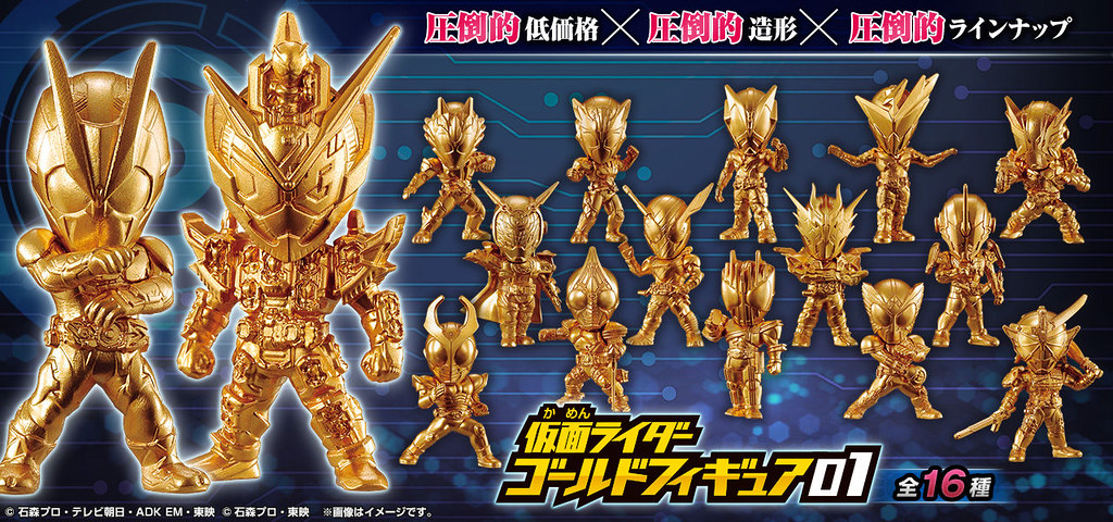 這款「《假面騎士》Gold Figure」的新收藏人物系列,是以「壓倒性的價格」×「壓倒性的造型」×「壓倒性的陣容」為概念,以日幣 180 元的價格,推出約3-4公分尺寸的高雕塑精密造型,一共16款食玩!並使用豪華、質感的金漆塗裝,營造金光閃閃的的土豪感(?)無論是大玩具人還是小玩具人,都可以輕易入手收藏!