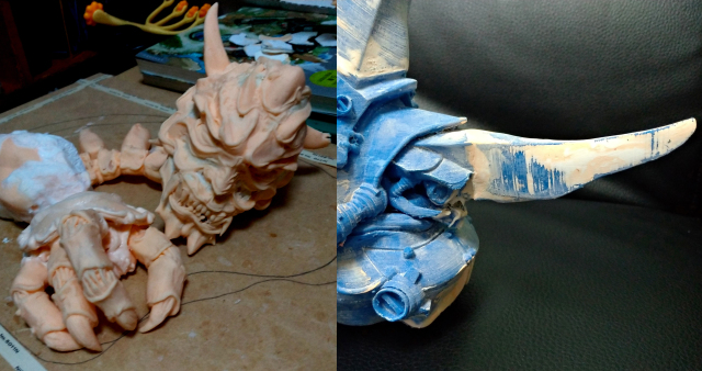 但很不幸在列印期間出現PLA材料問題,一直失敗有找不到原因情況下,只好就放棄繼續列印下去,直接將頭角、腰身、大腿與裙甲、手臂部分用黏土製作,也出現兩種素材結合的結構呈現。