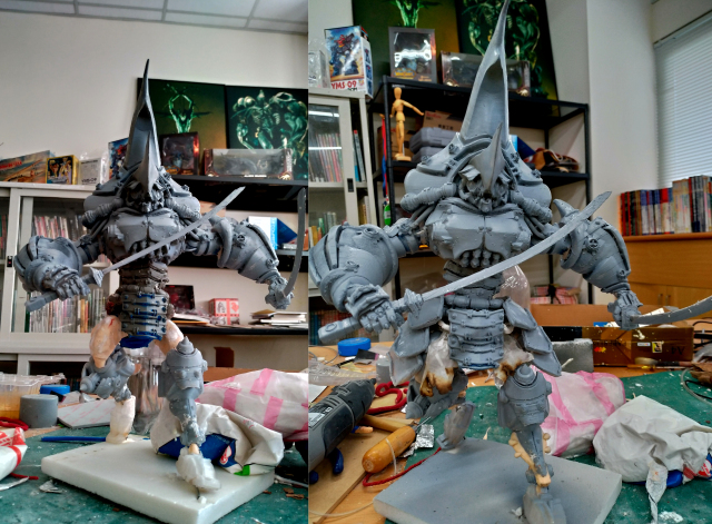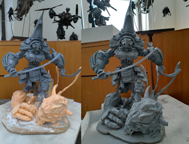 製作時一開始先到處收集資料,把兜蟲、鋼彈?武士與鬼面這些素材整理,並簡化生物結構,參考許多紙模型、Sculpture雕塑與木雕大師的作品。但說真的講到妖怪與武士,真的嚴重受到日本的傳統文化影響,造型上也很難跳脫名將系列、魔力小馬(潮與虎)、鬼太郎等日本動漫這些既有的造型認知。另外對於文化或造型上的不夠深入了解,往往會造成一些錯置的部分,例如竹鐵片甲結構、裙甲範圍、綁手與刀飾等等。