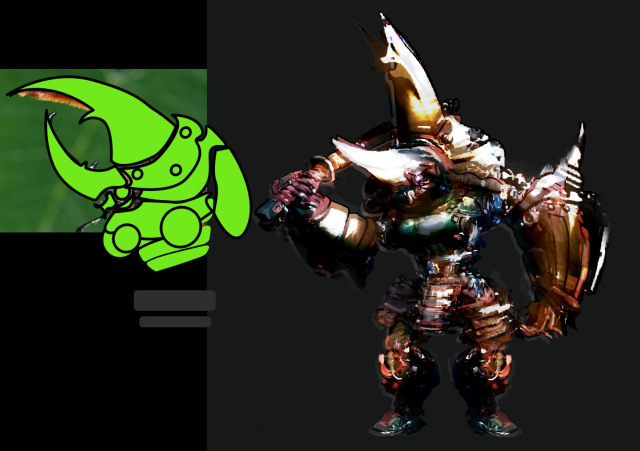 一開始發想時希望能結合地方特色的可能,剛好年底2019新竹動物園甲蟲館新開幕主打長戟大兜蟲。所以就以這個形象為出發點,試著將武士、科幻(蒸氣龐克)與妖怪這些元素結合成一個在地作品系列可能。