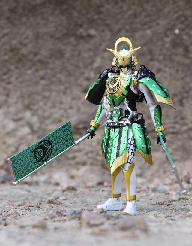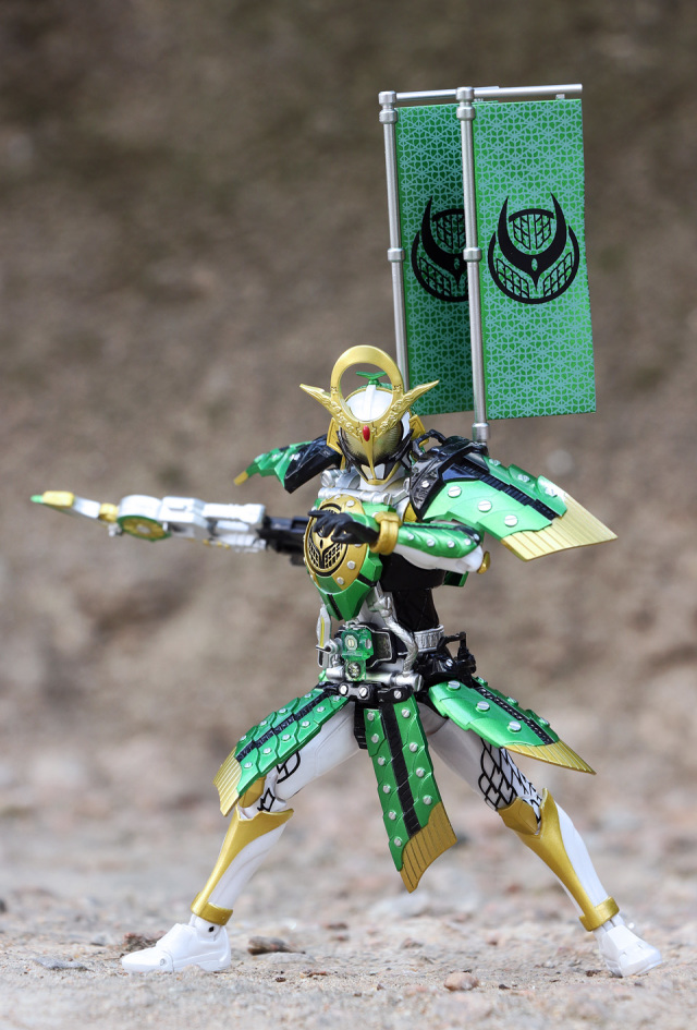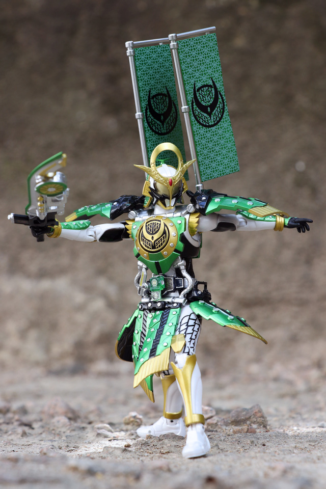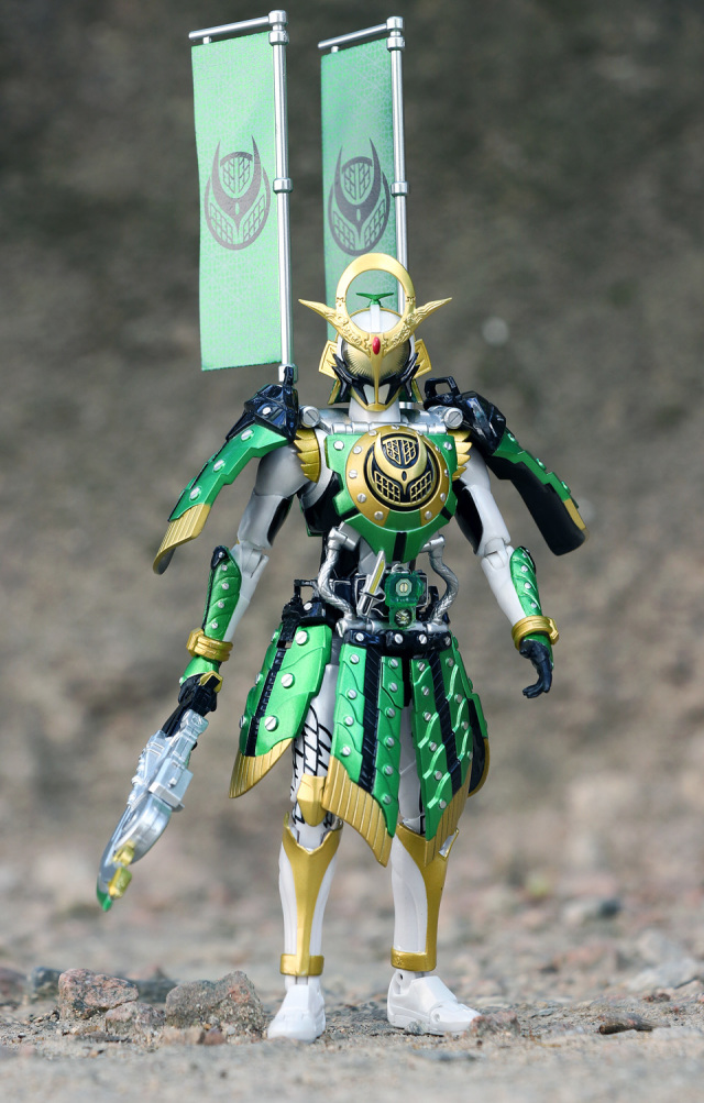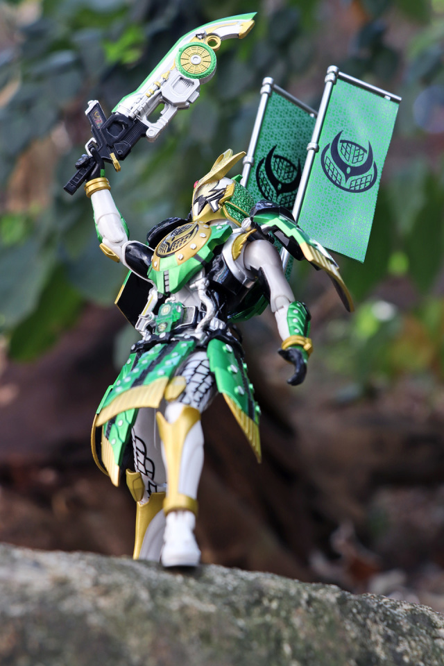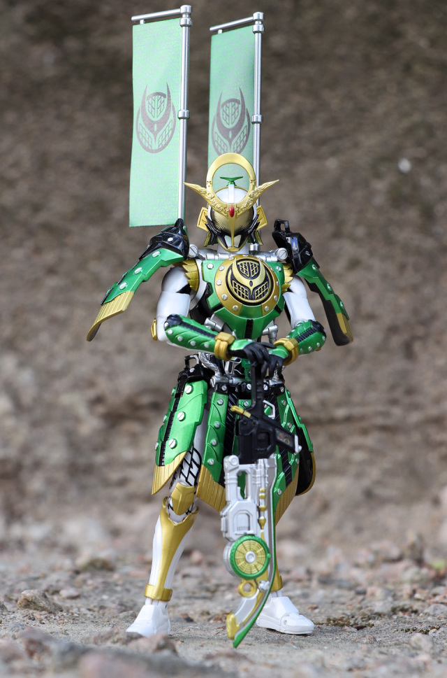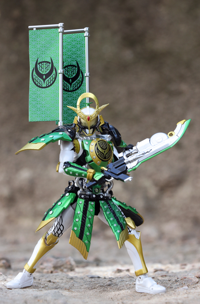 好!談回玩具吧!主體高約 150mm,因為他是平成超人中數一數二設計得較好的 Rider,所以 SHF 只要忠實地將他表達出來就不會太差了!而以前 SHF 也推出過鎧武的勝哄鎧甲,斬月雖沿用鎧武的部分零件,但頭雕和胸口圖騰完全是新規造型,另外主體的珍珠白和金屬綠色亦很亮麗。QC 方面只屬一般,PVC 白色膠混入了黑點;還好其他地方的著色總算不俗。由於武器比一般形態多,所以配件及可玩性蠻可以。