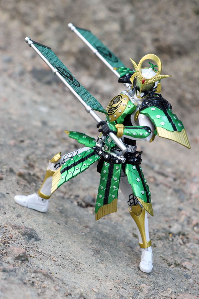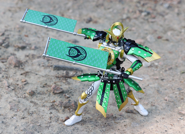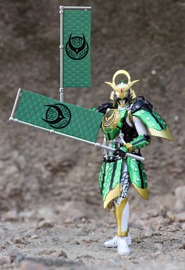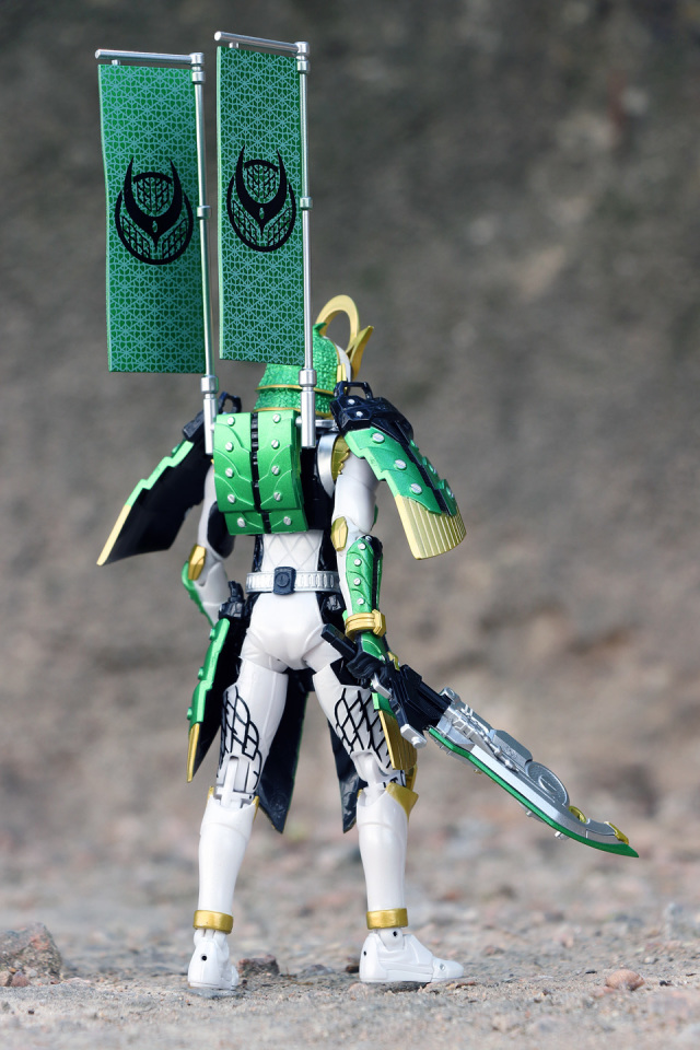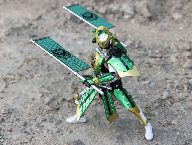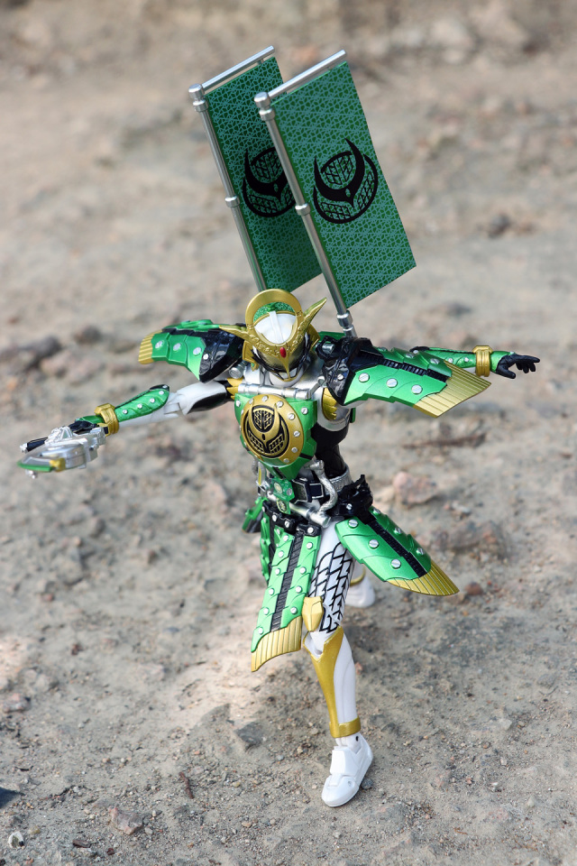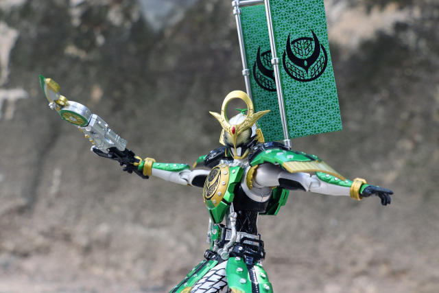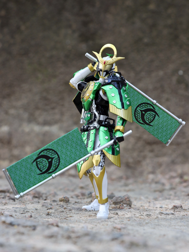 好!談回玩具吧!主體高約 150mm,因為他是平成超人中數一數二設計得較好的 Rider,所以 SHF 只要忠實地將他表達出來就不會太差了!而以前 SHF 也推出過鎧武的勝哄鎧甲,斬月雖沿用鎧武的部分零件,但頭雕和胸口圖騰完全是新規造型,另外主體的珍珠白和金屬綠色亦很亮麗。QC 方面只屬一般,PVC 白色膠混入了黑點;還好其他地方的著色總算不俗。由於武器比一般形態多,所以配件及可玩性蠻可以。