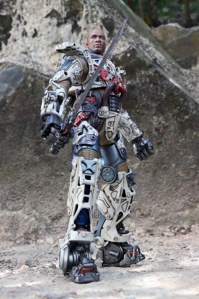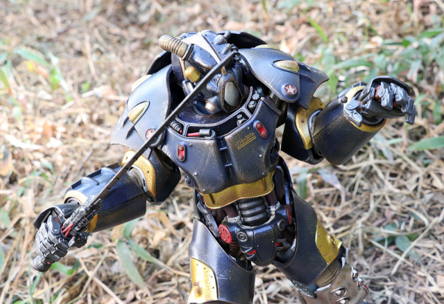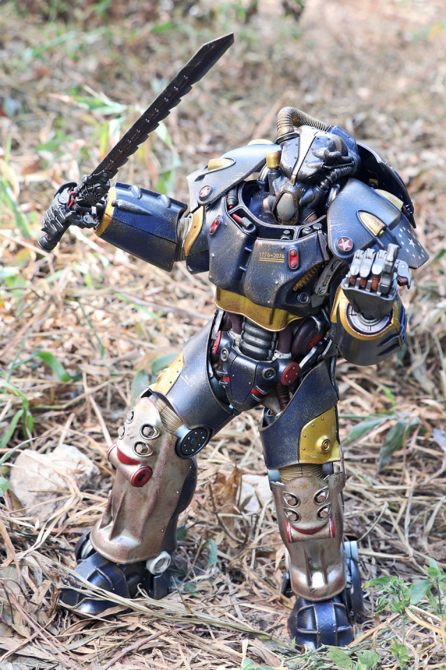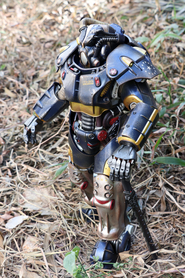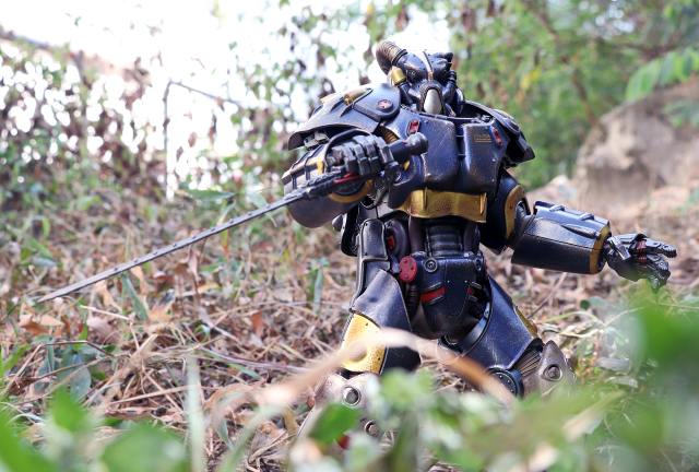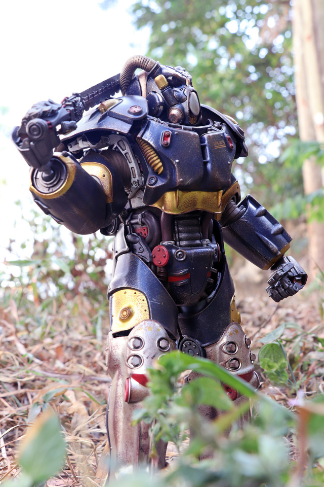 《異塵餘生》X-01 動力裝甲全高約 36.8cm,超過 35 個可動關節;配件較少,包括可互換的男性頭雕及武器 ”突擊者刀”等。頭盔配備 LED 發光功能,與 Threezero 推出的其他《異塵餘生》動力裝甲一樣,所有外部裝甲都可從身上拆卸,並可與其他三款已推出的動力裝甲互換,故可玩性不㣛。拆卸外部裝甲後可重現隱藏於裝甲下的機械骨骼結構。賣點當然是本体出色的舊化效果,及高度還原遊戲中的機械部件細節。缺點嘛...... 就是上甲後接近零的可動性,另手掌很難緊握武器,謹此面已!