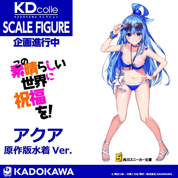 日本角川(KADOKAWA)旗下的玩具品牌「KDcolle(KADOKAWA Collection)」將推出《為美好的世界獻上祝福!》的新作:「阿克婭 原作版泳裝Ver.」(アクア 原作版水着Ver.)的 1/7比例 PVC模型,參考售價為 13,800 日圓,預計將於 2020 年 05月發售。
