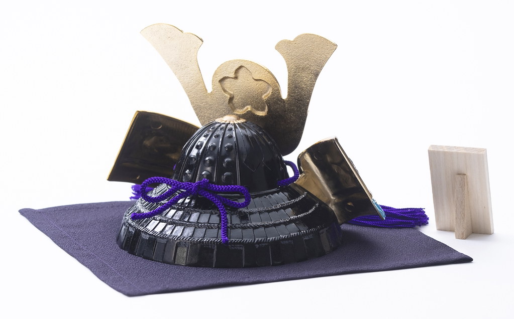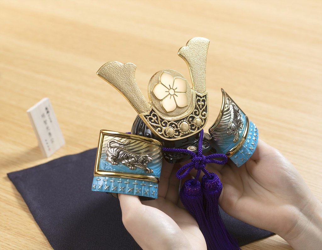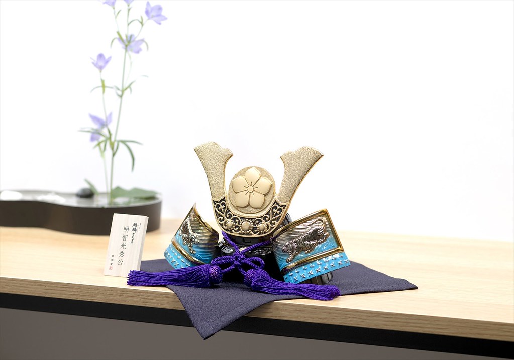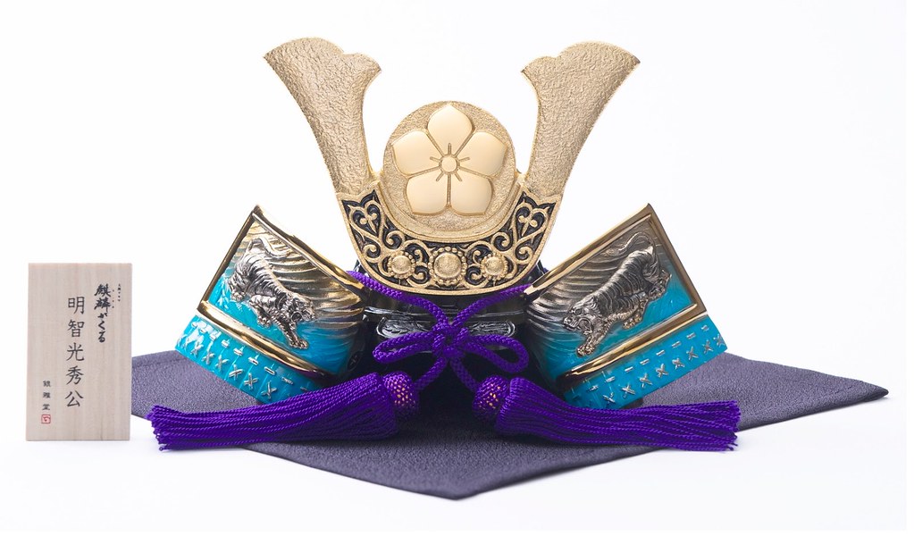銀雅堂取得《麒麟來了》官方授權,用職人工藝打造明智光秀頭盔擺飾,鍬形前冠中佩掛著桔梗紋牌,經職人打磨成光滑鏡面。左右兩片擋板兜吹返以明智家紋常見的水藍色呈現,頭盔主體的黑色更凸顯了裝飾的質感。雖然屬於戰場裝備,卻也透露出光秀聰明而沉穩的形象。