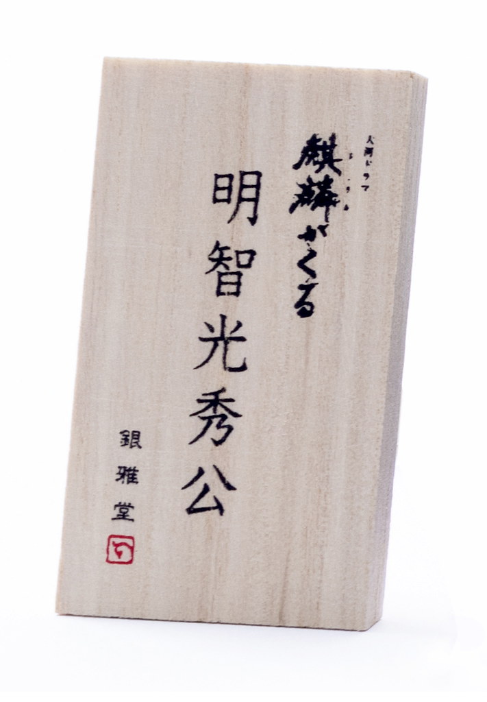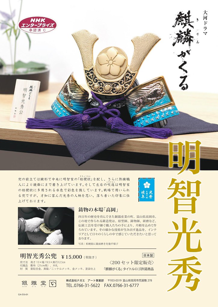 日本 NHK 電視台 於 2020 年播出的第 59 部大河劇《麒麟來了》(麒麟がくる)官方授權給擁有 400 年銅器製造歷史的「銀雅堂」(ぎんがどう),限量打造 200 套「明智光秀 頭盔擺飾」(明智光秀公兜),售價為日幣15000圓,預計將在 2020 年 1 月 15 日發售。